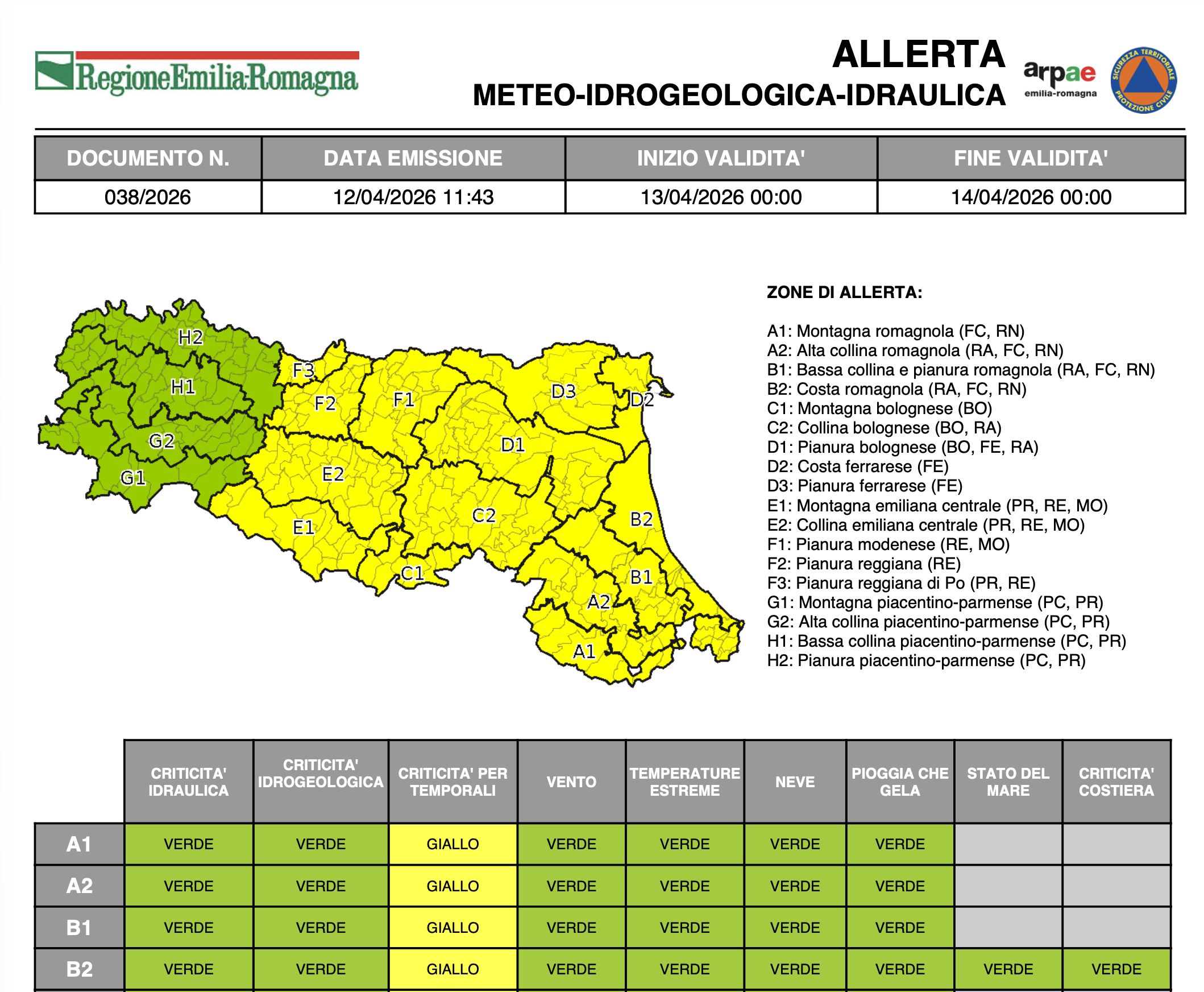 Emessa “Allerta Gialla” per criticità temporali per lunedì 13 aprile