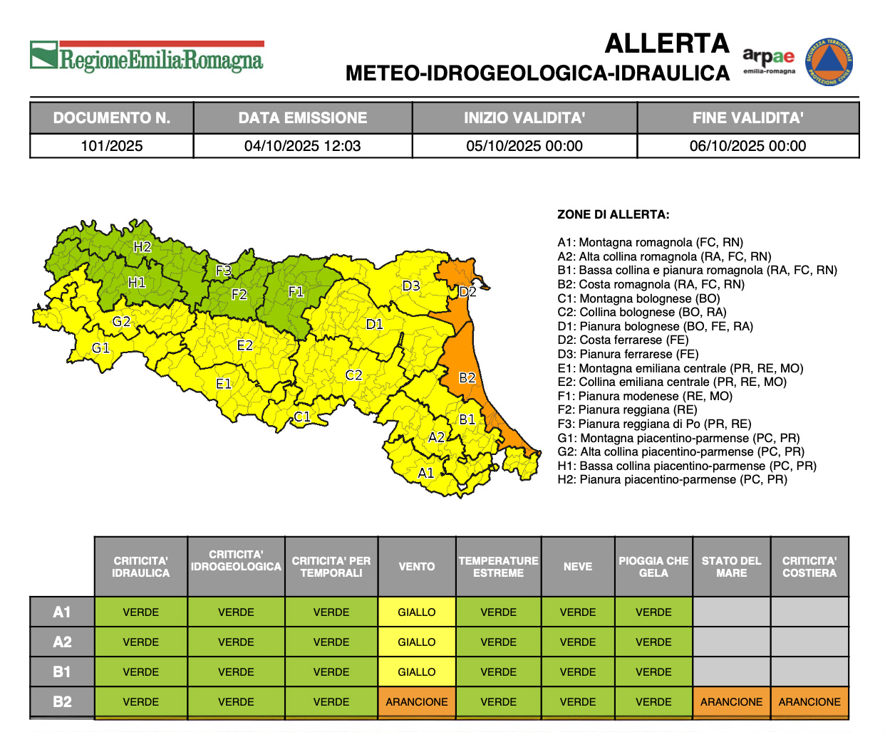 Nella prima parte della giornata di domenica 5 ottobre è previsto un aumento della ventilazione, che riguarderà i rilievi appenninici con venti sud-occidentali di burrasca moderata (62–74 km/h) e la fascia costiera con venti nord-orientali di burrasca forte (75-88 Km/h), con rinforzi o raffiche di intensità superiore. È previsto mare agitato al largo, con altezza dell'onda superiore a 3,20 m. Le condizioni del mare sotto costa potranno generare fenomeni di ingressione marina ed erosione del litorale, tenendo conto anche dell'assenza della duna invernale. Le precipitazioni previste sui rilievi potranno generare occasionali fenomeni franosi, ruscellamenti lungo i versanti e rapidi innalzamenti dei livelli idrometrici nel reticolo idrografico minore