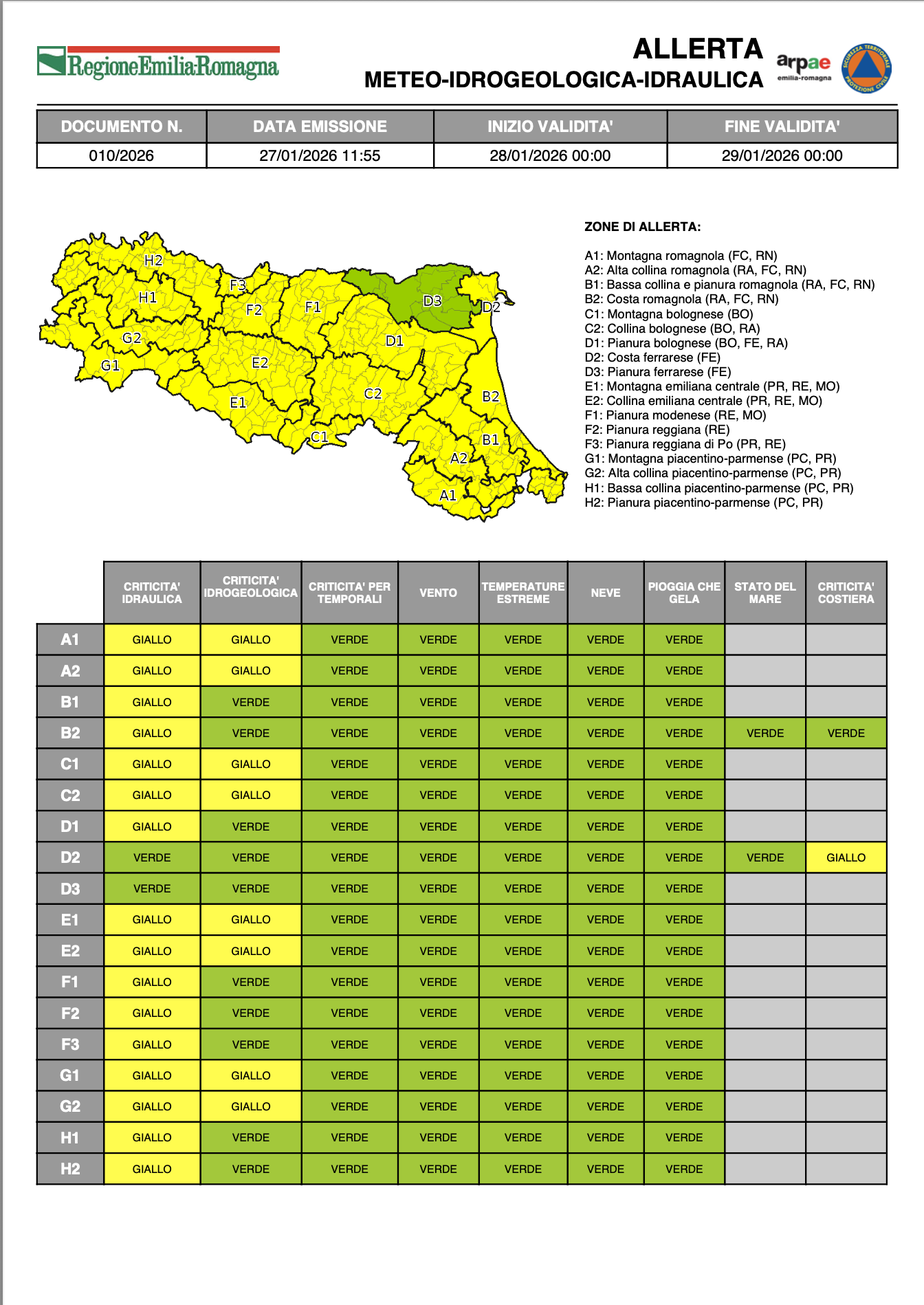 Per la giornata di mercoledì 28 gennaio sono previste precipitazioni diffuse, anche a carattere di rovescio sulle aree appenniniche, che potranno generare localizzati fenomeni franosi, ruscellamenti sui versanti e rapidi innalzamenti dei livelli idrometrici dei fiumi e dei corsi minori con generalizzati superamenti delle soglie 1 e localizzati superamenti delle soglie 2 nelle sezioni montane. Sui rilievi occidentali non si escludono occasionali fenomeni di pioggia che gela al suolo. Dal pomeriggio si prevedono venti forti (50-61 Km/h) dai quadranti meridionali sui rilievi, con possibili temporanei ulteriori rinforzi sulle zone di crinale. Ventilazione sostenuta da sud-est anche lungo la costa, associata ad un aumento del moto ondoso dal mattino, fino a molto mosso al largo e condizioni del mare sotto costa che possono generare localizzati fenomeni di ingressione marina ed erosione del litorale, in particolare sulla costa settentrionale dove sono presenti vulnerabilità pregresse.