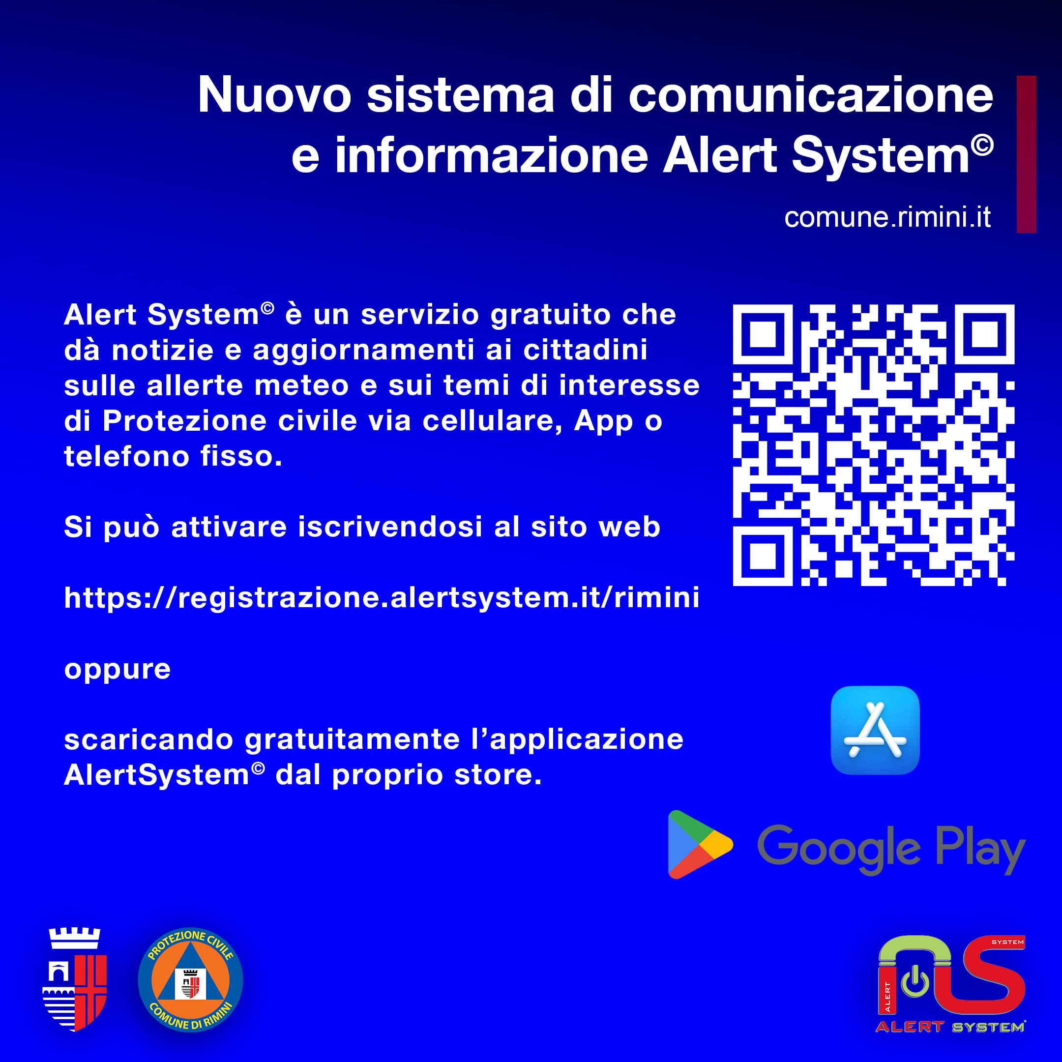 Si ricorda inoltre che nel Comune di Rimini è attivo il servizio gratuito Alert System via cellulare, App o telefono fisso e si può attivare iscrivendosi al sito web (https://registrazione.alertsystem.it/rimini) oppure scaricando gratuitamente l’applicazione Alert System dal proprio store. Si consiglia di attivare sia la funzione web che di scaricare la App .
