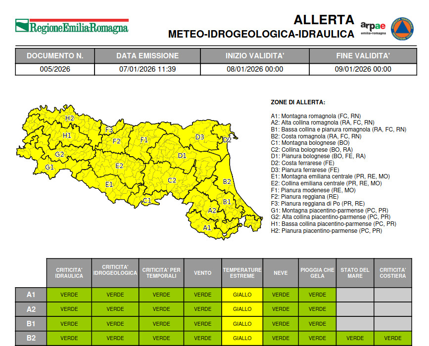La Protezione civile regionale dell’Emilia Romagna ha emesso un’allerta meteo “gialla ” per temperature estreme , per la giornata di domani - 8 gennaio - che riguarda anche l’area di riferimento “B2” che ricomprende la Provincia di Rimini.