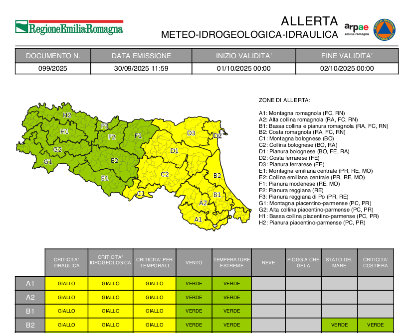 Per la giornata di mercoledì 1 ottobre sono previste condizioni favorevoli allo sviluppo di temporali forti, con possibili effetti e danni associati. I temporali sono previsti già dalle prime ore della notte e assumeranno particolare intensità sul settore centro-orientale della regione. Dal pomeriggio è attesa una graduale attenuazione dei fenomeni. Si prevedono inoltre venti forti (50-61 Km/h) da nord-est con possibili temporanei rinforzi o raffiche di intensità superiore lungo la costa e sui crinali appenninici ed un aumento del moto ondoso fino a molto mosso al largo. Nel settore orientale della regione con particolare riferimento ai bacini collinari si prevedono livelli idrometrici superiori alla soglia 1. Lungo i rilievi orientali saranno possibili localizzati fenomeni di ruscellamento lungo i versanti, innalzamenti del reticolo idrografico minore e fenomeni di allagamento nelle aree pianeggianti ed urbane costiere. Pur con valori sotto le soglie di riferimento, dalla serata non si escludono localizzati fenomeni di erosione del litorale ed interessamento delle spiagge