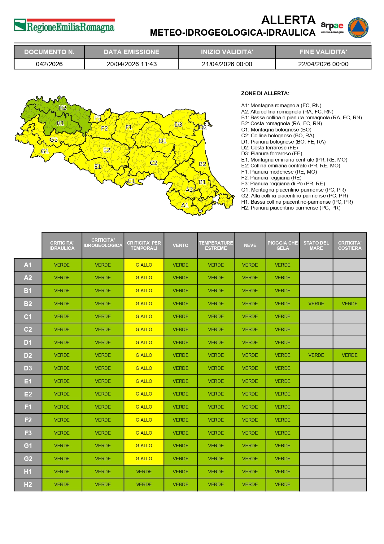 Per martedì 21 aprile si prevedono precipitazioni diffuse su tutto il territorio regionale, anche a carattere di rovescio o temporale di forte intensità. I fenomeni risulteranno più persistenti e organizzati sulla pianura centro-orientale e lungo i rilievi, con possibili effetti e danni associati; saranno invece più localizzati nel resto della regione. Non si escludono rapidi innalzamenti dei livelli idrometrici nei corsi d'acqua che in maniera puntuale potrebbero superare la soglia 1 e occasionali