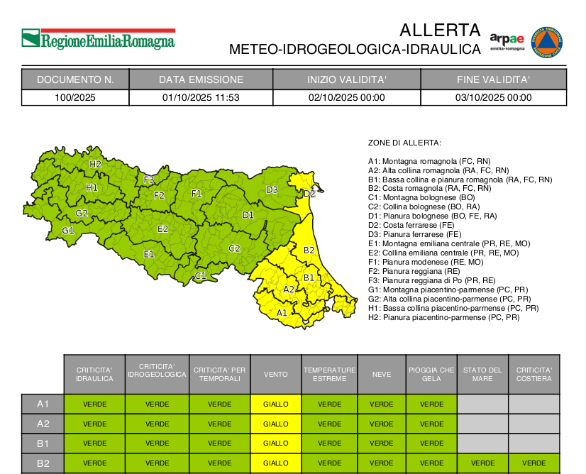 Per la giornata di giovedì 2 ottobre sono previsti venti di burrasca moderata (62-74 km/h) da nord-est, con possibili temporanei rinforzi, sul settore costiero e sull'Appennino orientale. Pur con valori sotto le soglie di riferimento, per effetto dell'incremento del moto ondoso sotto costa, non si escludono localizzati fenomeni di erosione dei litorali ed interessamento delle spiagge.