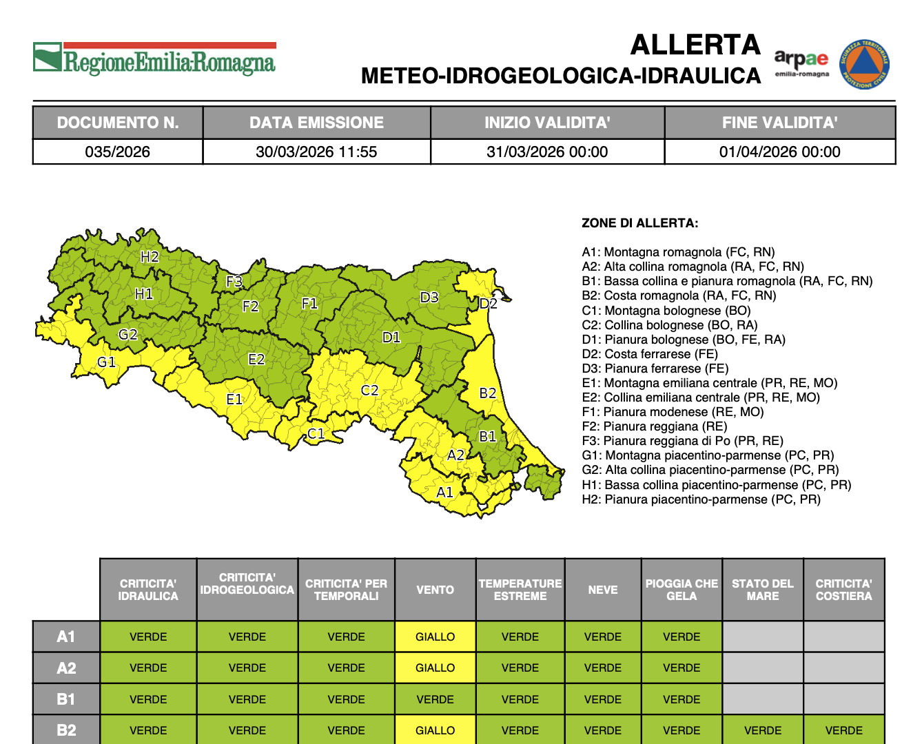 Emessa allerta meteo “gialla” per vento per martedì 31 marzo
