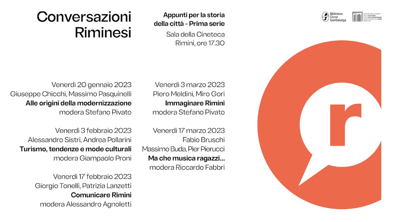 Conversazioni riminesi. Appunti per la storia della città è il titolo della prima serie di incontri con testimoni, osservatori e studiosi, organizzati dall’Istituto per la storia della Resistenza e dell’età contemporanea della provincia di Rimini in collaborazione con la Biblioteca civica Gambalunga, a partire da venerdì 20 gennaio (Sala della Cineteca, Biblioteca Gambalunga, ore 17.30), con lo scopo di creare un archivio di testimonianze e fonti sulla storia contemporanea della città e aprire un dibattito utile al presente e al futuro.