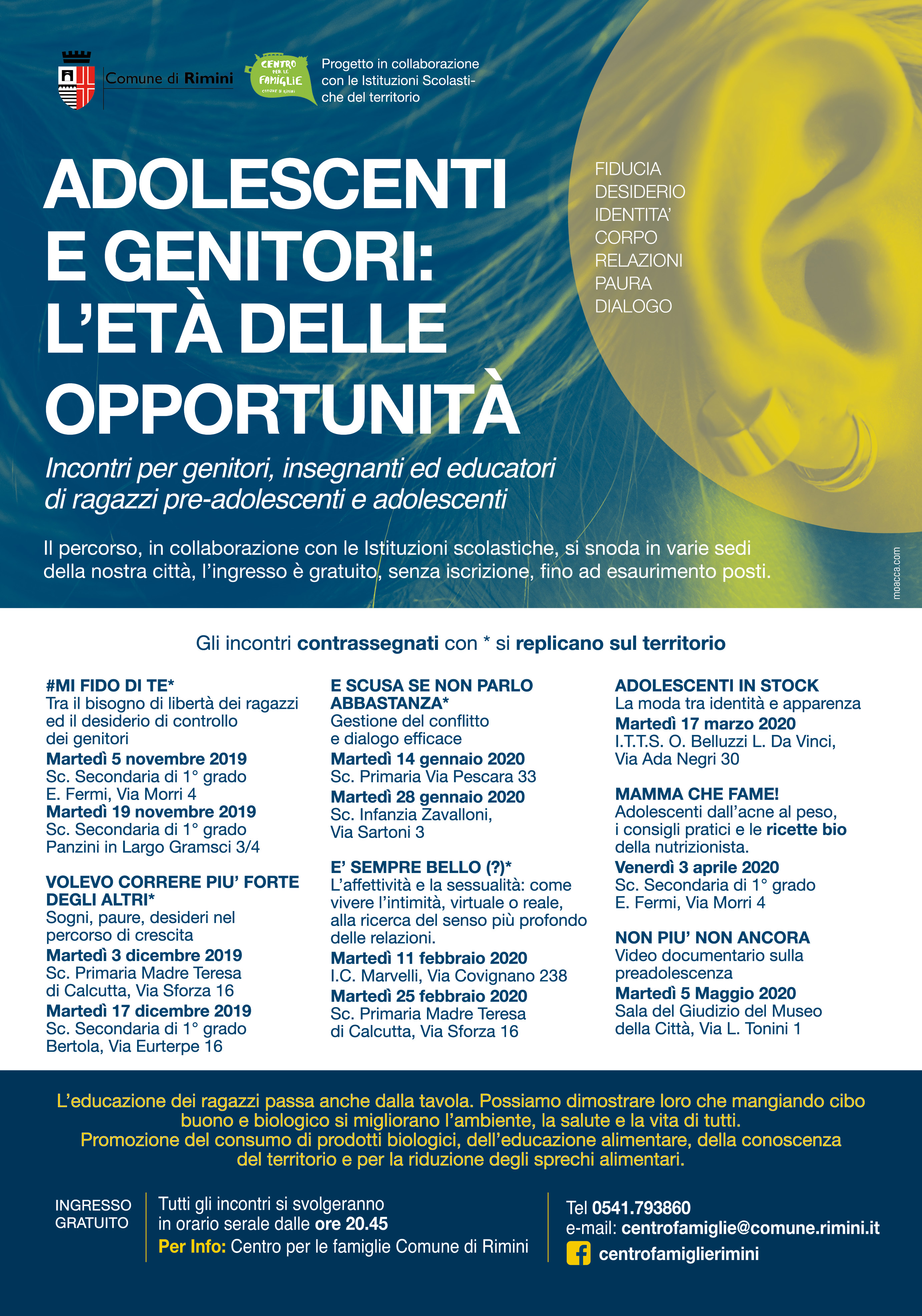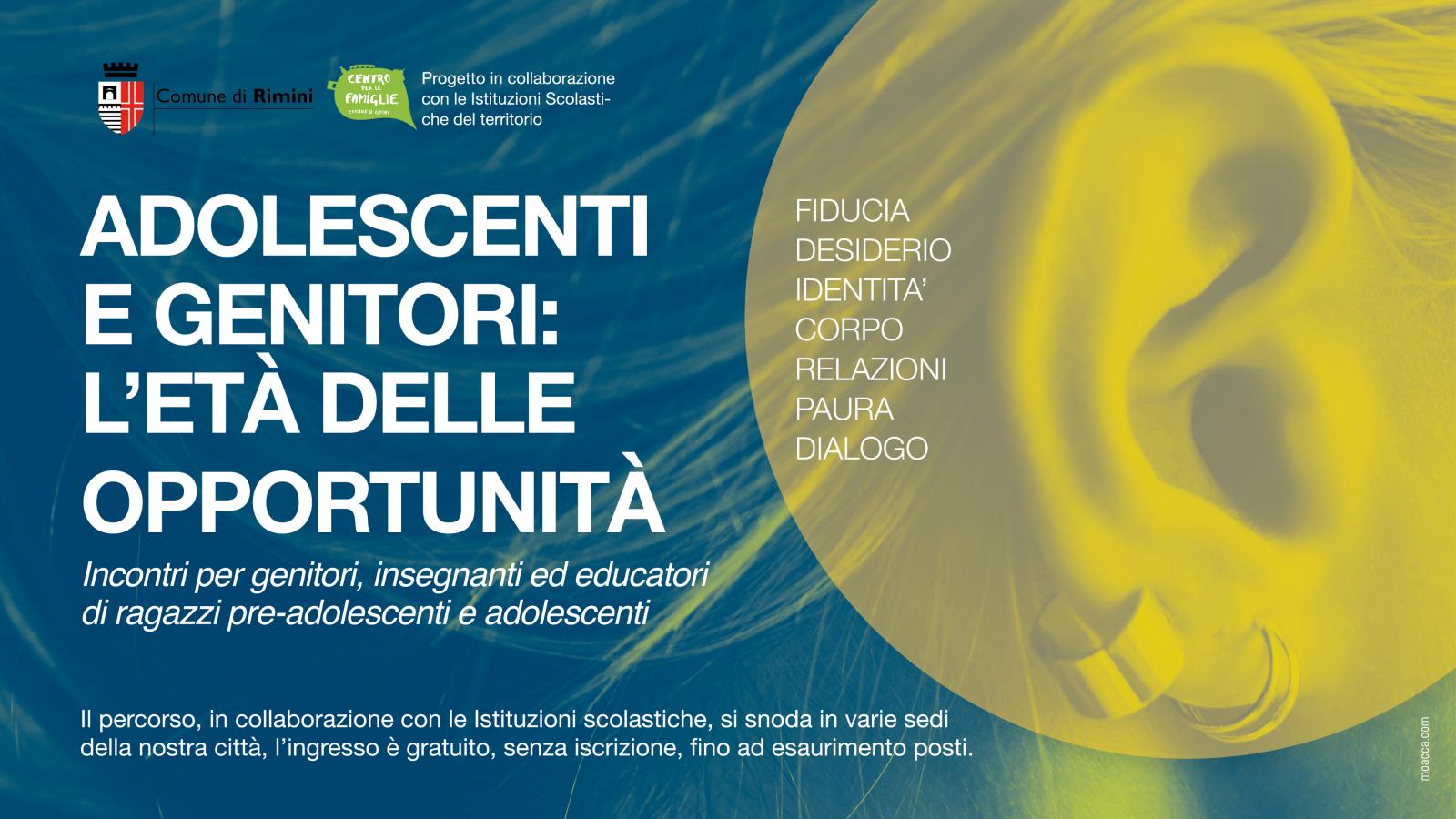 Torna il ciclo di incontri “Adolescenti e genitori: l'età delle opportunità”, organizzato dal Centro per le Famiglie del Comune di Rimini rivolto a genitori, insegnanti ed educatori di giovani tra i 9 e i 18 anni!