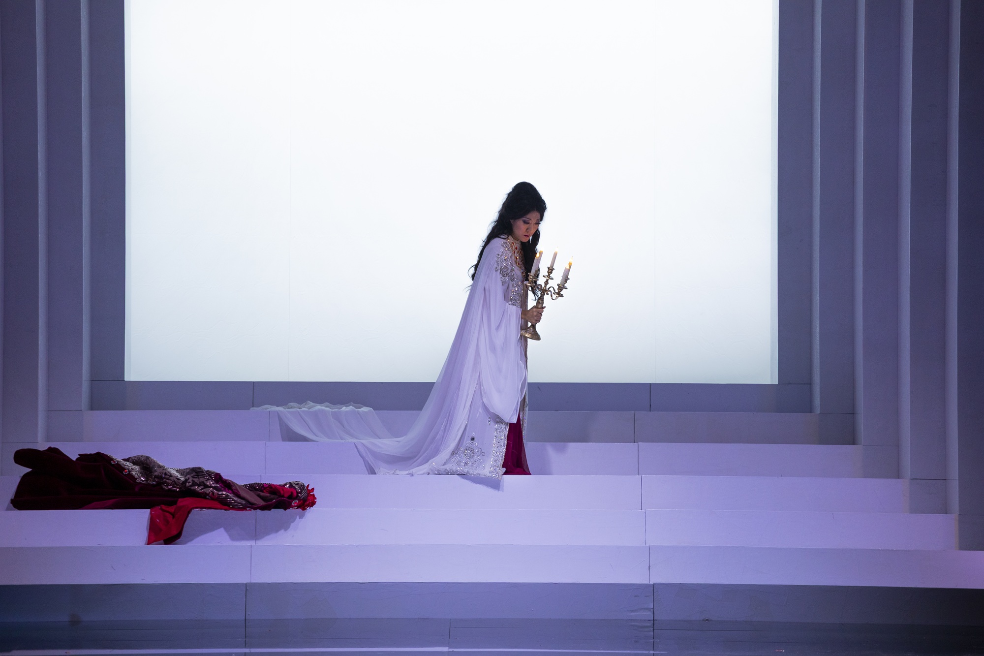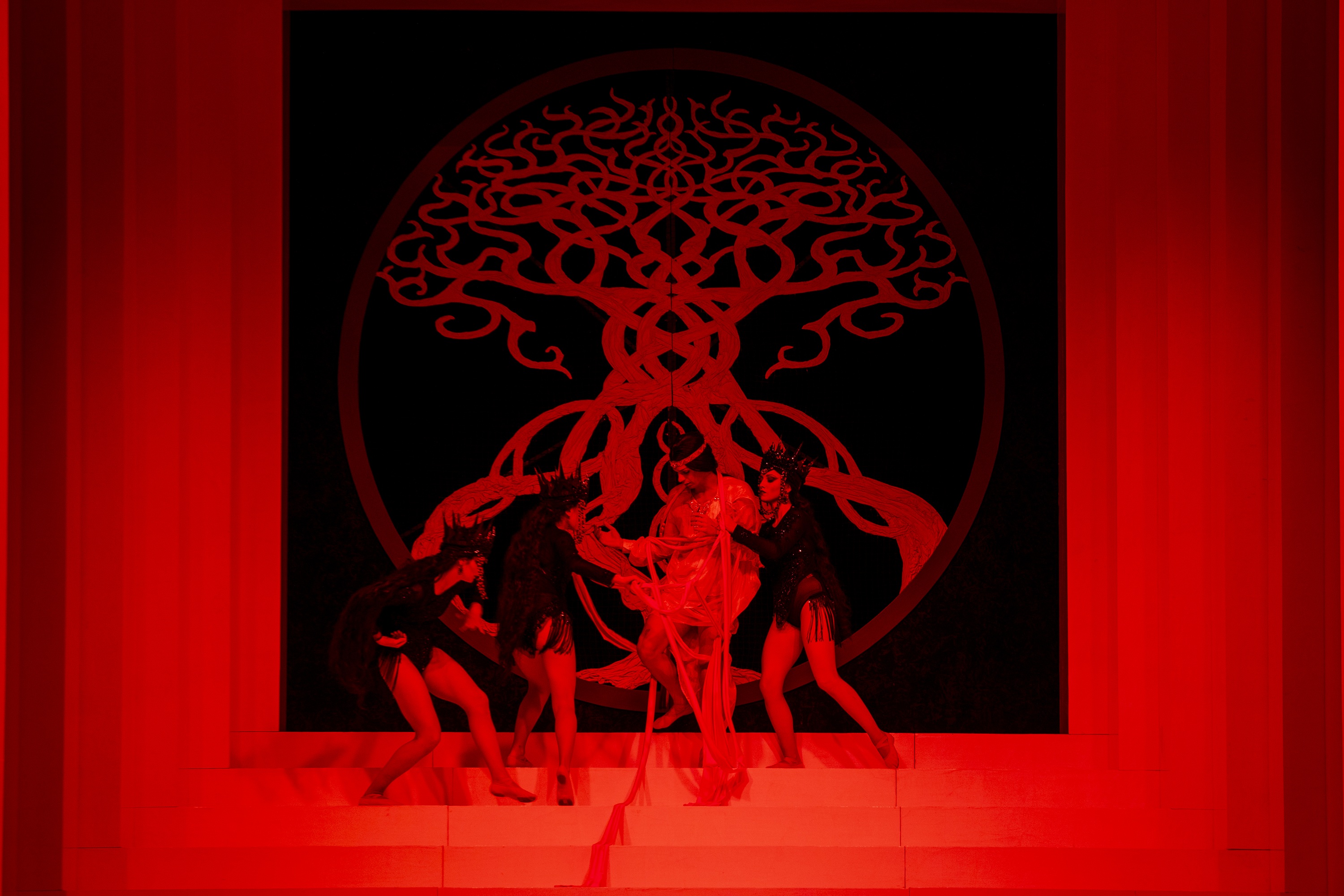 Sarà un Macbeth epico, di grande impatto visivo, dove “l’asciutta geometricità della scena, che è ridotta a pura struttura e linea” – come da progetto di Tiziano Santi – contrasta con i sontuosi costumi di Giuseppe Palella, che “incarnano la dimensione sacra e vertiginosa del mito”, come racconta Ceresa che sottolinea: “Il mondo geometrico e rigoroso delle cornici quadrate trova così un controcanto di opulenza sacra, come se l’universo stesso, nel momento in cui si manifesta, non potesse che farlo con un’immagine di tragica bellezza.