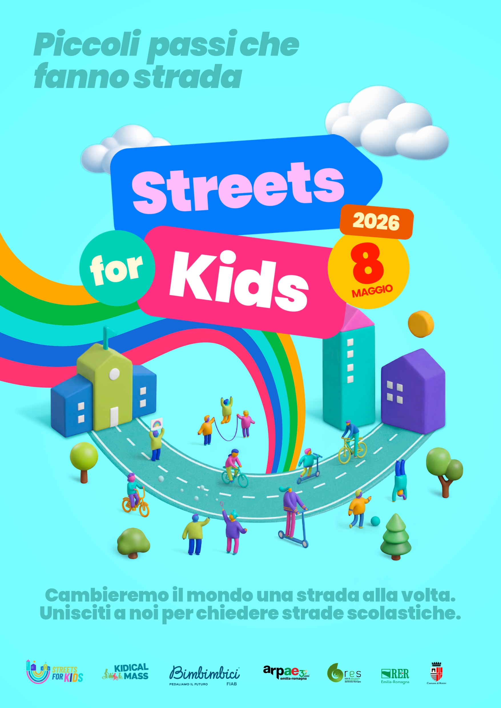 Anche Rimini aderisce alla campagna "Streets for kids" il giorno 8 maggio 2026 con la sperimentazione di tre strade scolastiche presso le scuole primarie "Ferrari", "Fellini" e "Rodari".