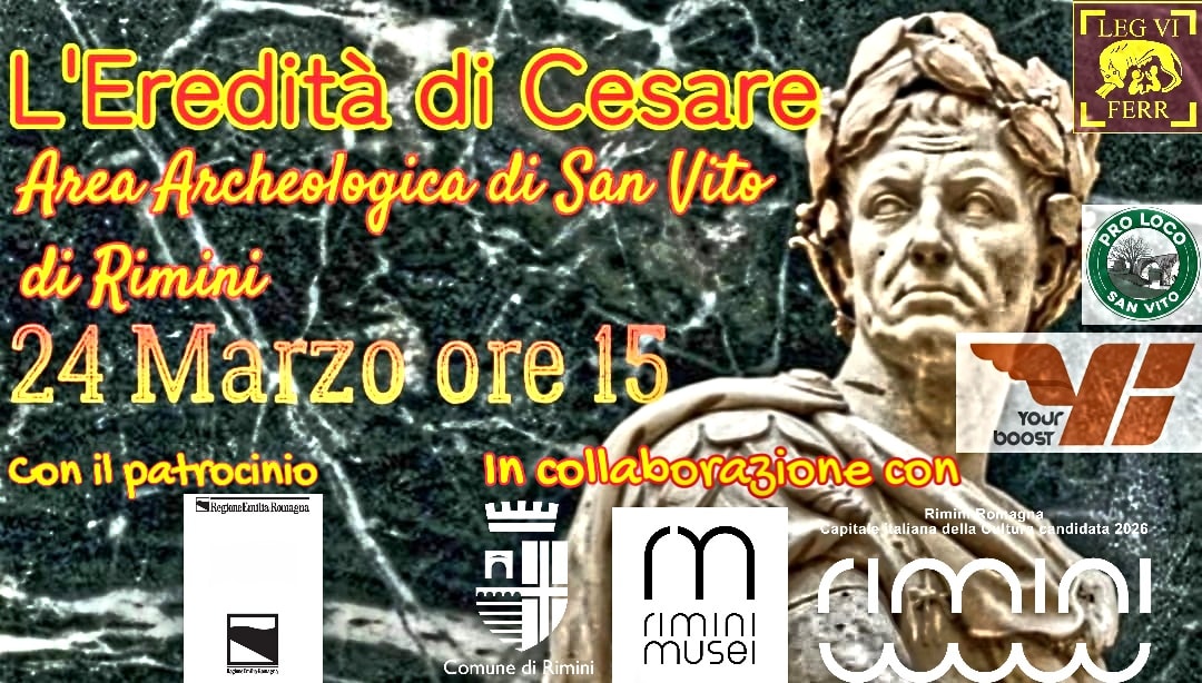 Domenica 22 marzo a San Vito di Rimini, l’evento "L’Eredità di Cesare" propone un coinvolgente viaggio nel tempo che alterna approfondimento scientifico e spettacolo epico: il pubblico potrà assistere alla proiezione di un documentario sul Rubicone e all'intervento della Dott.ssa Ravara Montebelli, per poi vivere l'emozione di una fedele ricostruzione storica del funerale di Giulio Cesare con la Legio VI Ferrata. Tra cortei in costume, l'accensione della pira e la lettura del solenne monologo shakespeariano, la manifestazione offre un'esperienza, che si concluderà con una visita guidata alla scoperta delle preziose aree archeologiche locali.
