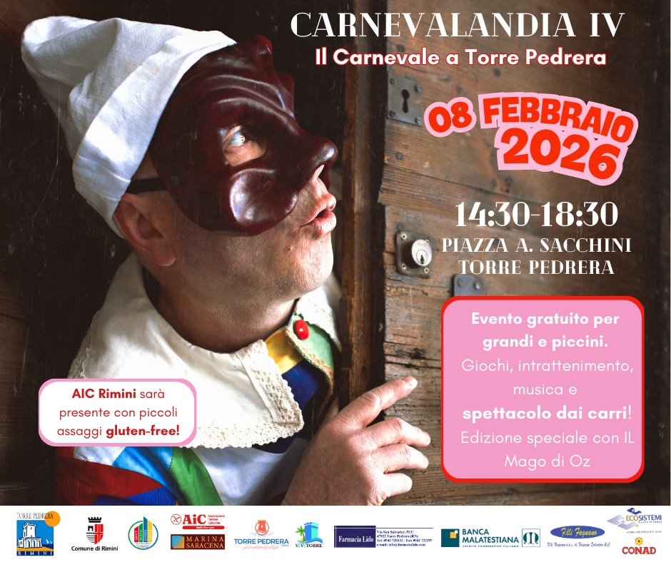 Sempre domenica 8 febbraio la festa coinvolge anche la zona nord di Rimini con Carnevalandia, organizzata dal Comitato Turistico di Torre Pedrera in Piazza Sacchini. Quest'anno la quarta edizione dell'evento è dedicata al mondo de "Il Mago di Oz": dalle 14.30 personaggi stravaganti animeranno la piazza per i più piccoli, mentre alle 16.30 avrà inizio lo spettacolo dei carri. La partecipazione è gratuita e pensata per far vivere a pieno l'atmosfera del Carnevale a pochi passi dal mare.