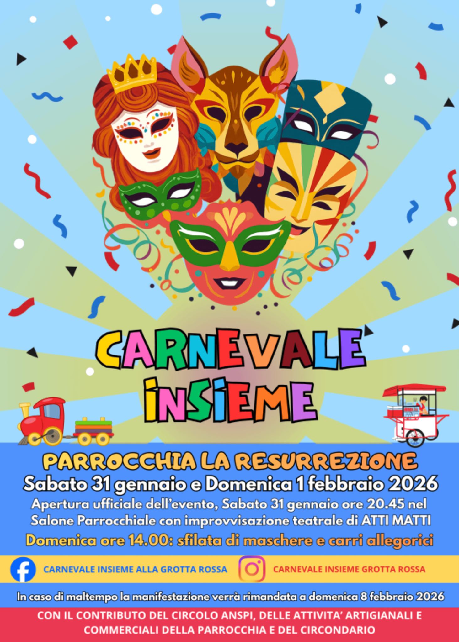 Le celebrazioni prendono il via già alla fine di gennaio con il Carnevale Insieme alla Grotta Rossa, presso la parrocchia La Resurrezione di Don Oreste Benzi. Sabato 31 gennaio alle 20.45 si terrà una serata di improvvisazione teatrale a cura degli "Atti Matti", mentre domenica 1 febbraio alle 14.00 ci si ritrova per la tradizionale sfilata di maschere e carri allegorici. (In caso di maltempo, l'intero programma sarà posticipato a domenica 8 febbraio).