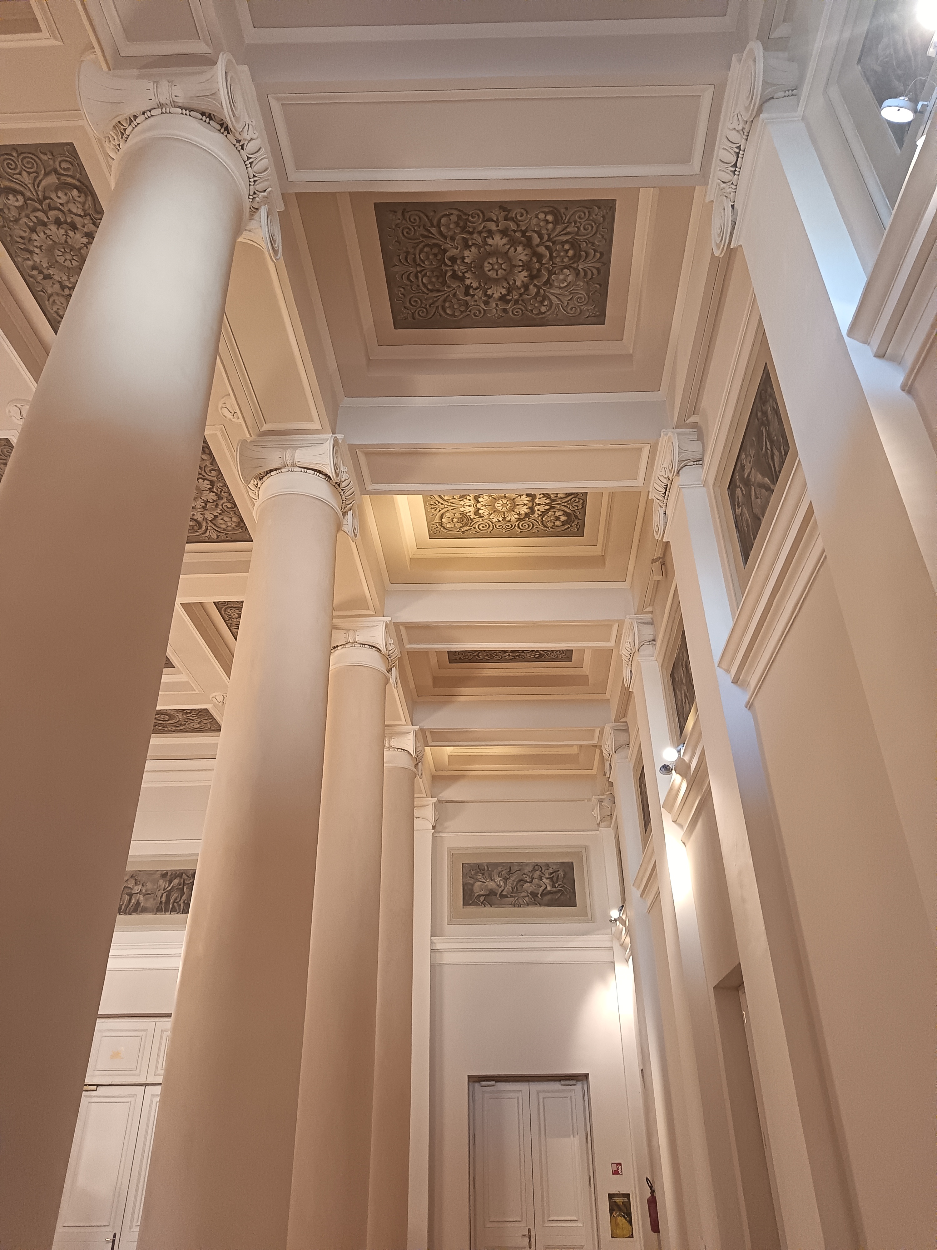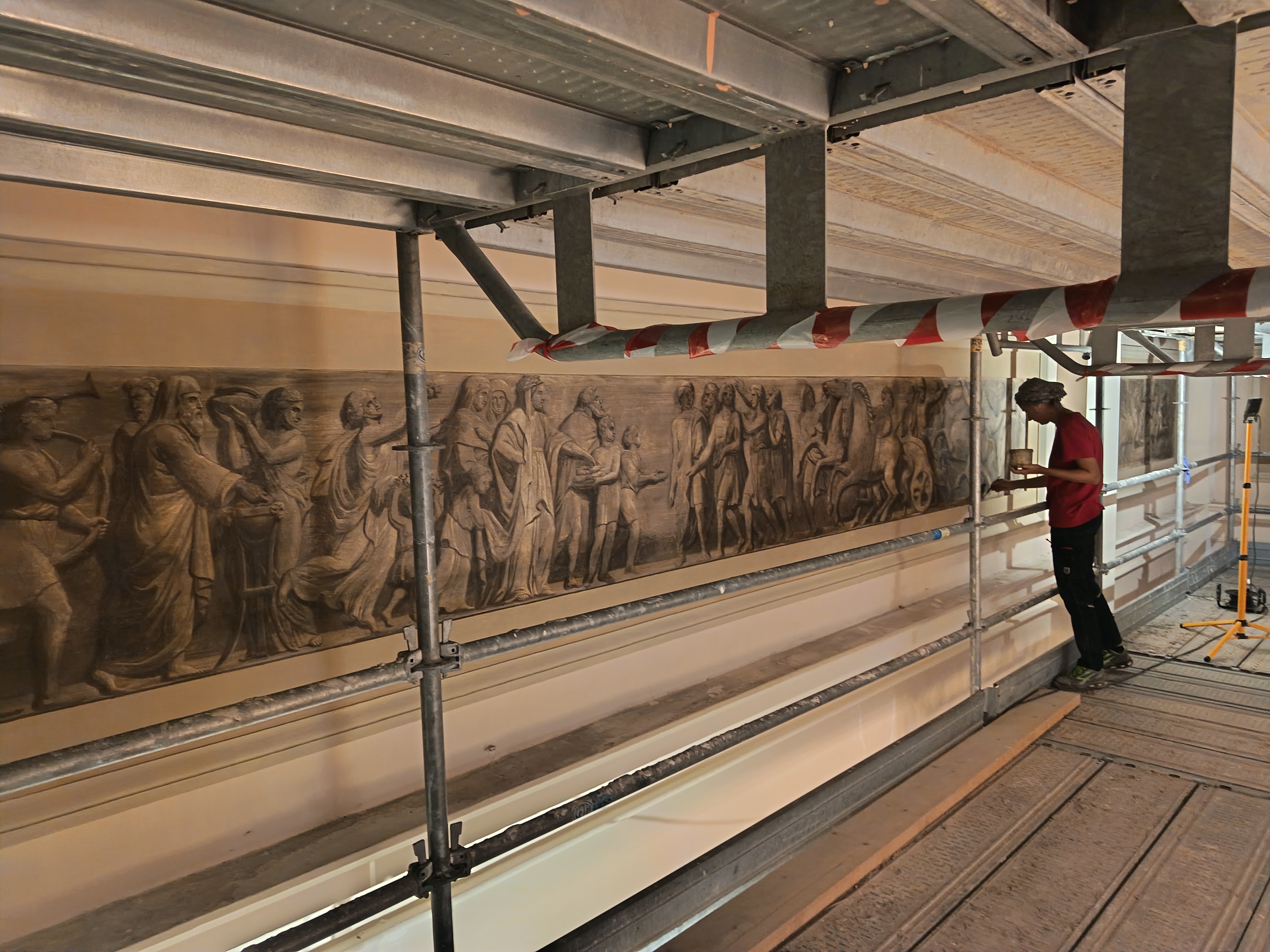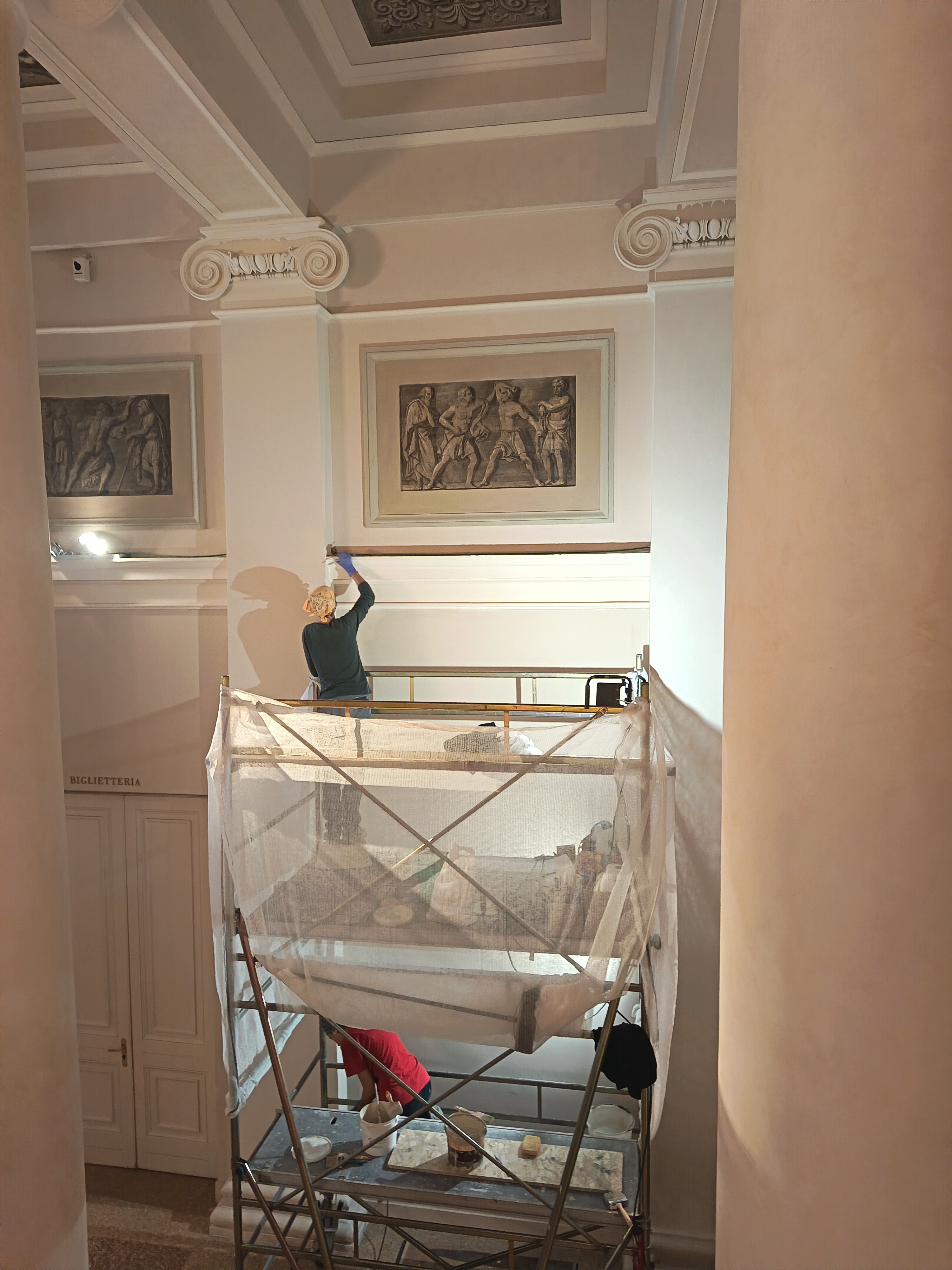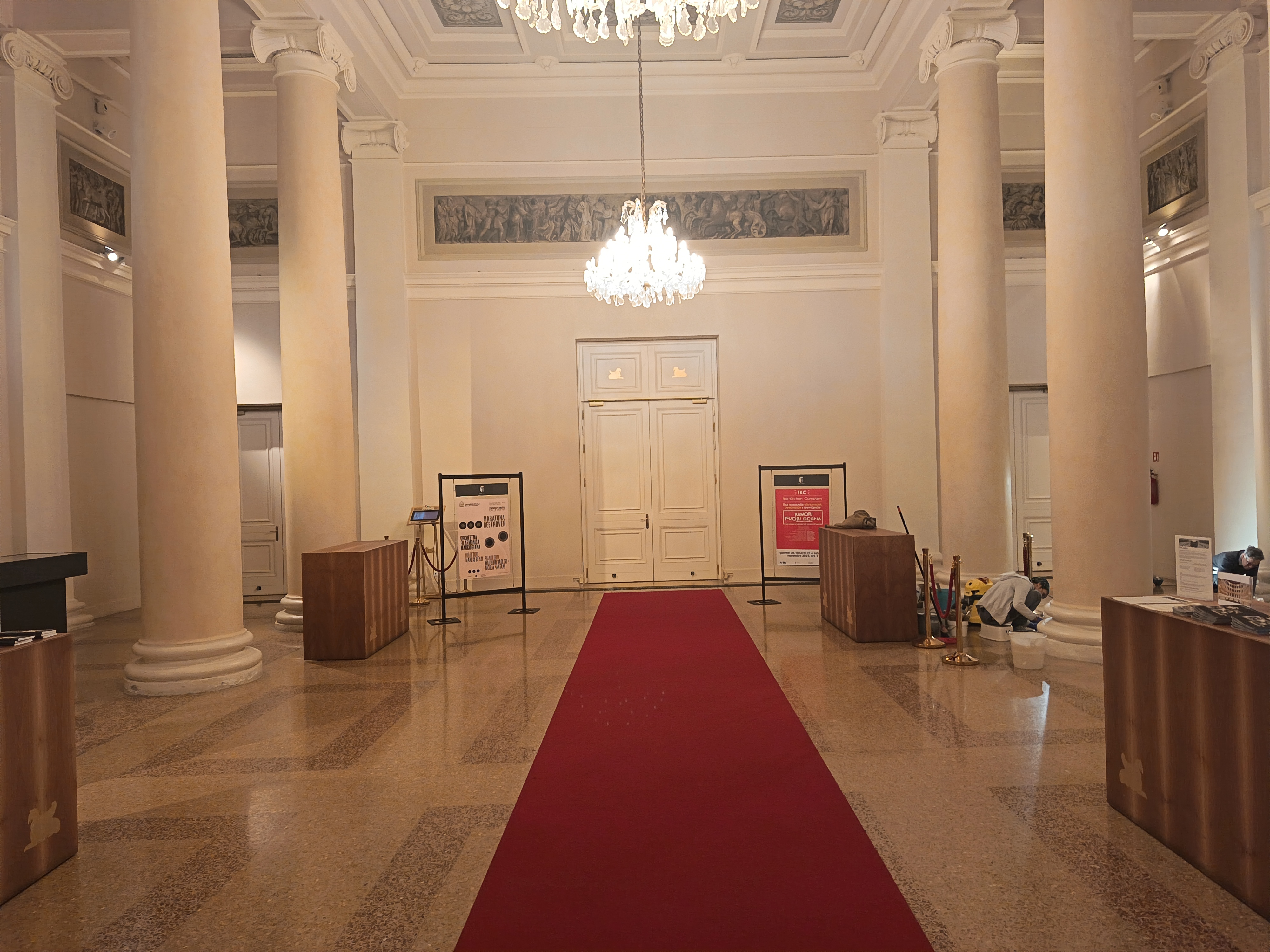I lavori, avviati nel maggio 2025 e da poco conclusi, hanno riguardato tutte le componenti decorative e strutturali del foyer: dal controsoffitto in camera canna ai lacunari, dalle colonne agli stucchi, fino agli intonaci e alle preziose pitture parietali. Le operazioni hanno restituito uniformità e armonia all'insieme degli apparati decorativi, preservando l'integrità storico-artistica dello spazio.