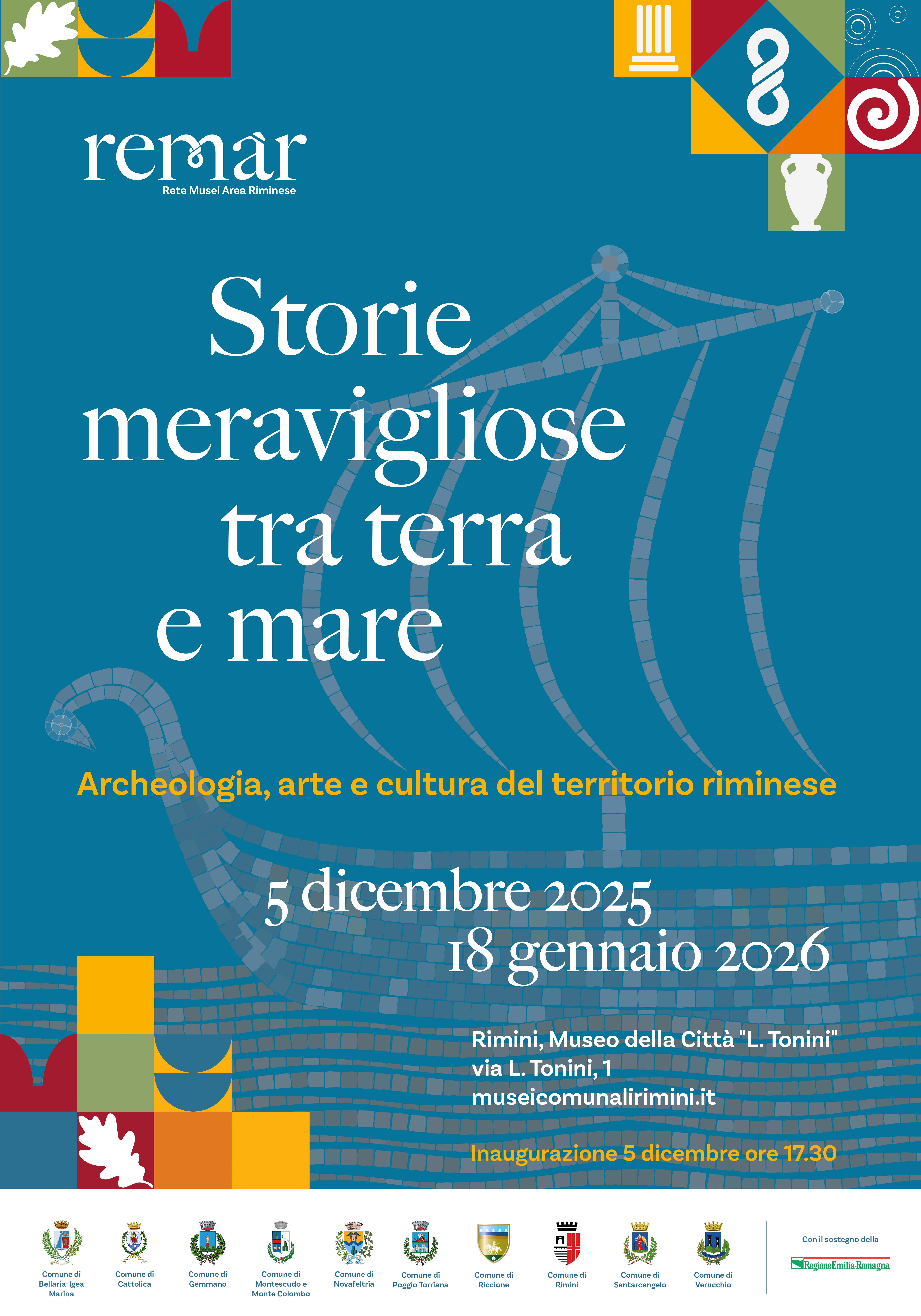Venerdì 5 dicembre, alle ore 17,30 al Museo della Città, inaugura Storie meravigliose tra terra e mare, la prima mostra di REMÀR, la Rete dei Musei di Area Riminese. Esposti nella Sala Teche reperti e testimonianze storiche artistiche provenienti da 23 musei del territorio, tra Rimini, Bellaria-Igea Marina, Cattolica, Montescudo-Montecolombo, Perticara (Novafeltria), Poggio-Torriana, Riccione, Santarcangelo di Romagna e Verucchio: un territorio incardinato tra collina e pianura, tra fiumi e mare, che proprio nelle molteplici collezioni storiche, archeologiche, etnografiche, artistiche, trova preziose chiavi di lettura e di scoperta della storia, delle tradizioni, delle esperienze di donne e uomini attraverso il tempo.