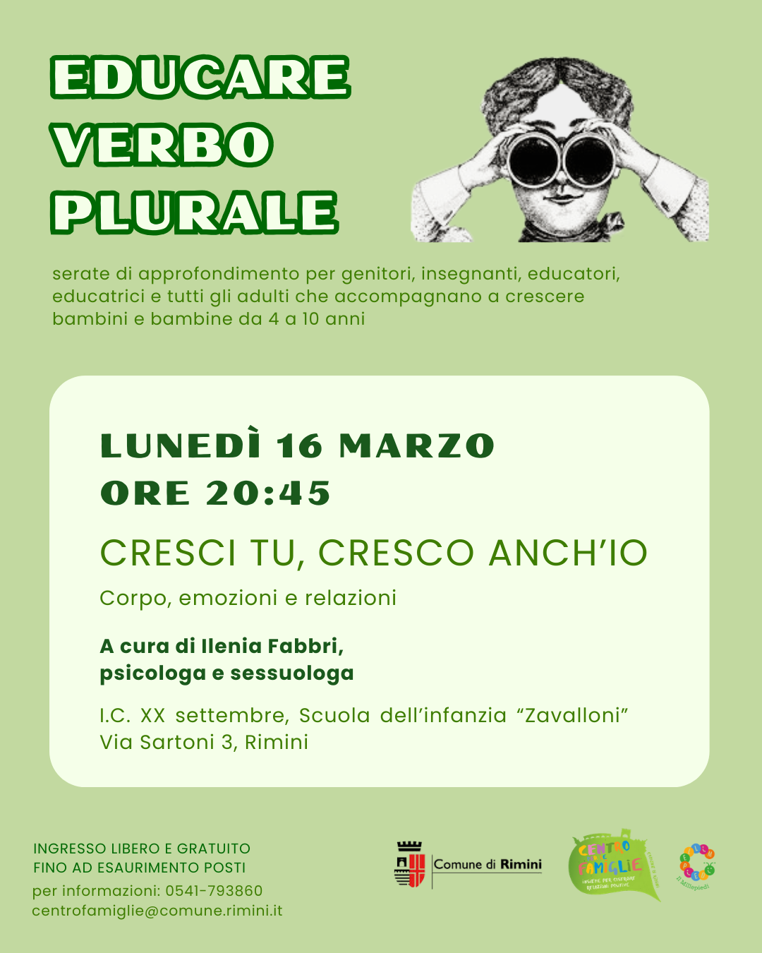 Prosegue il percorso Educare Verbo Plurale a cura del Centro per le Famiglie del Comune di Rimini, con un nuovo appuntamento dal titolo “Cresci tu, cresco anch’io: corpo, emozioni e relazioni”, un incontro pensato per genitori, insegnanti, educatori ed educatrici che desiderano approfondire il tema della crescita affettiva, corporea e relazionale dei bambini e bambine dai 4 ai 10 anni.