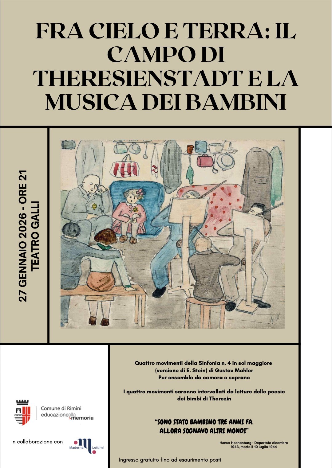 La serata del 27 gennaio porterà il pubblico nel cuore della memoria attraverso un linguaggio universale: quello della musica. Alle ore 21, il Teatro Galli ospiterà "Fra cielo e terra: il campo di Theresienstadt e la musica dei bambini”. Gli studenti del conservatorio Maderna-Lettimi eseguiranno i 4 movimenti dell Sinfonia n.4 di Gustav Mahler (versione da camera di E. Stein), intervallata da letture delle poesie dei bambini di Terezín: un omaggio alla resistenza culturale e umana, anche dentro l’orrore del ghetto-campo. L'esecuzione comprenderà i quattro movimenti dell'opera, dall'apertura riflessiva del "Bedächtig, Nicht eilen" fino al celebre finale "Das himmlische Leben" ("La vita celeste"), tratto dalla raccolta "Des Knaben Wunderhorn" e affidato alla voce solista del soprano.