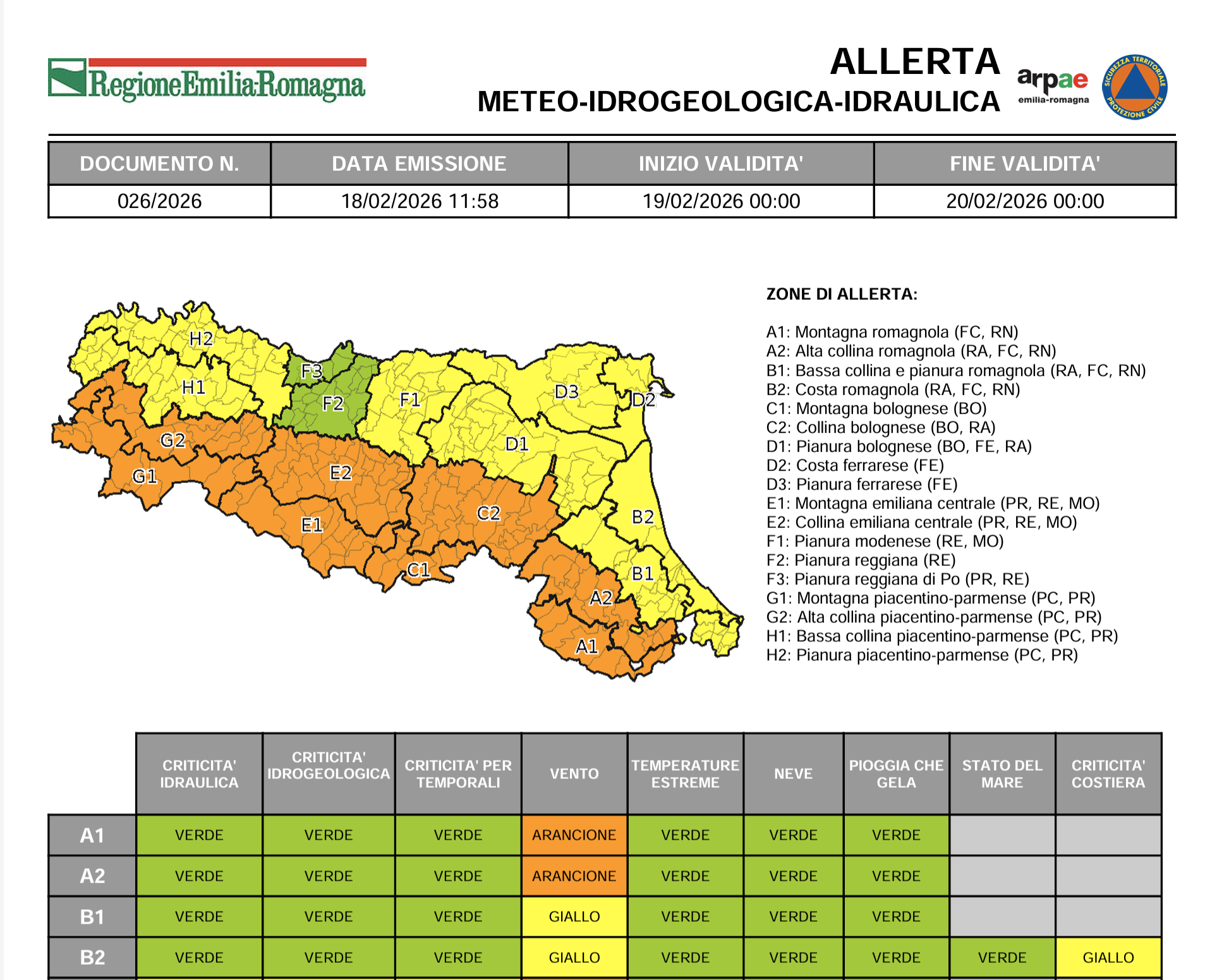 Per la giornata di giovedì 19 febbraio sono previste precipitazioni intense, localmente anche a carattere di rovescio e/o temporale, più probabili sul settore appenninico centro-occidentale e sulla pianura occidentale. Sono inoltre previsti venti meridionali di burrasca forte (75-88 Km/h) con rinforzi o raffiche di intensità superiore sull’intera fascia appenninica. Venti di burrasca moderata (62 – 74 km/h) dai quadranti meridionali con rinforzi o raffiche anche di intensità superiore sono previsti invece sulla pianura centro-orientale e sulla costa. Le precipitazioni previste potranno generare localizzati fenomeni franosi, ruscellamento sui versanti e rapidi innalzamenti dei livelli idrometrici nei corsi d’acqua con superamenti della soglia 1. Sono inoltre previste condizioni del mare sotto costa che potranno generare localizzati fenomeni di ingressione marina ed erosione del litorale, in particolare nel settore centrosettentrionale.