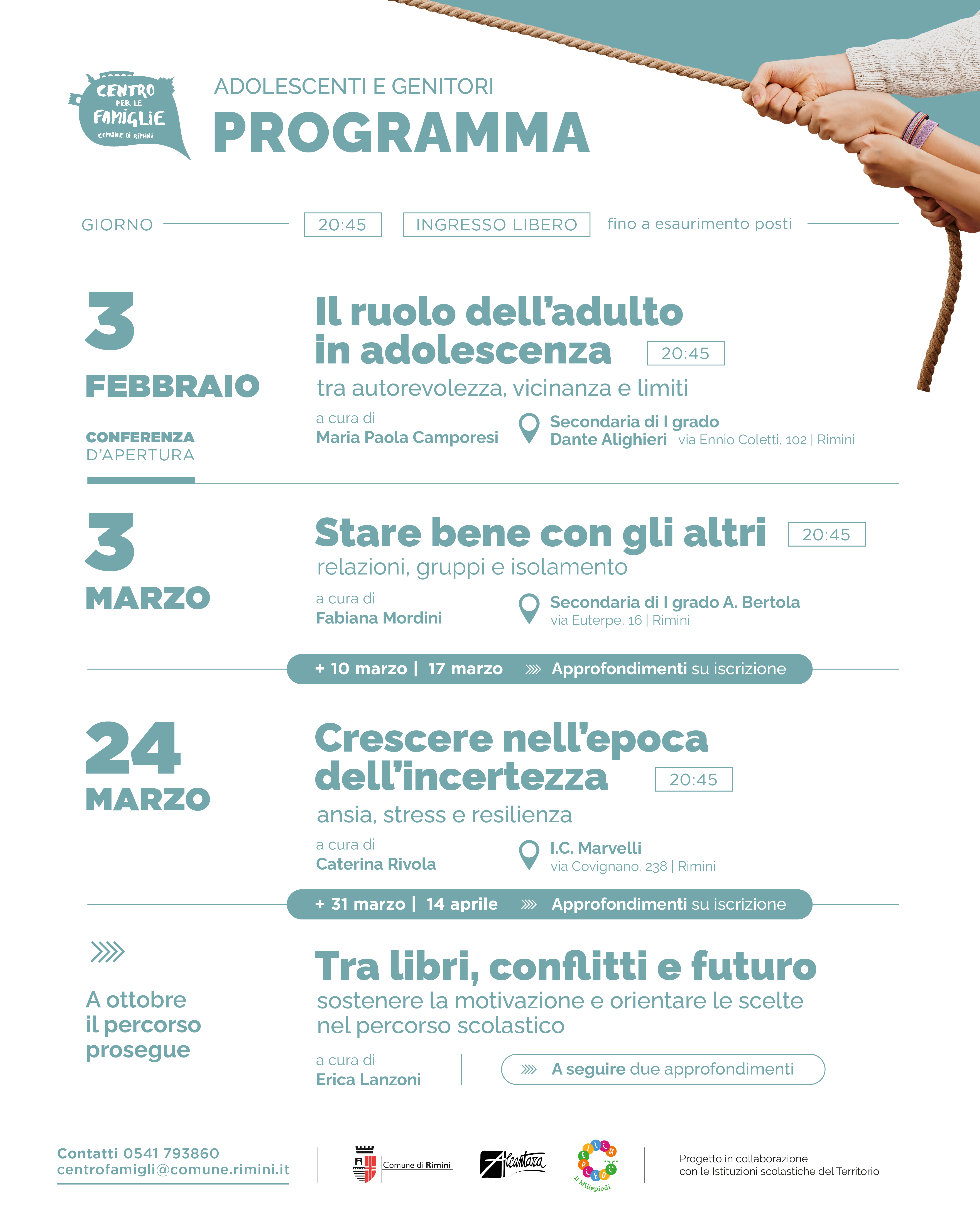Un progetto che si rivolge a genitori, insegnanti ed educatori di ragazze e ragazzi in età preadolescenziale e adolescenziale, con l’obiettivo di offrire spazi di riflessione, confronto e approfondimento sulle trasformazioni che attraversano i giovani e sulle sfide educative che coinvolgono il mondo adulto. Accompagnare gli adolescenti oggi significa spesso navigare a vista tra dubbi e cambiamenti, ma proprio dentro quelle fatiche che a volte ci spaventano, si nascondono le energie vitali e le risorse necessarie per crescere insieme, il tema trasversale a tutti gli incontri in programma sarà quello di comprendere come stare nelle fatiche e valorizzare le potenzialità.