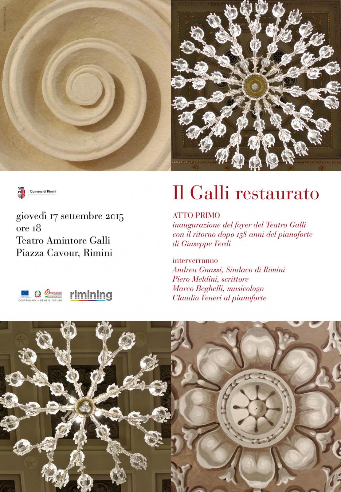 “L’inaugurazione del foyer non è solo il primo passo verso la riappropriazione del Teatro Galli ma già uno step avanzato - commenta il sindaco Andrea Gnassi – In questi mesi abbiamo già iniziato ad invitare i riminesi a scoprire gli spazi del foyer attraverso qualche mostra o iniziativa. E abbiamo toccato con mano l’emozione dei riminesi nel vedere il loro teatro che comincia a riprendere vita. Oggi riconquistiamo e per sempre un importante contenitore culturale, polifunzionale, un tassello del nuovo polo culturale del centro storico (Teatro, Fulgor, Piazza Malatesta) che stiamo disegnando. Non ci sarà da attendere ancora per molto per vedere concretizzata l’intera opera”.