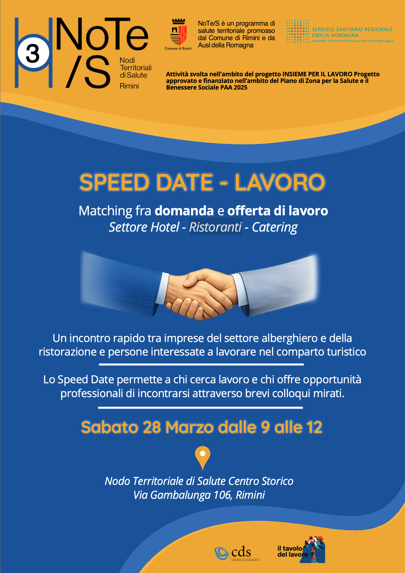 Nell’ambito delle attività progettuali è in programma anche un primo momento pubblico di incontro tra domanda e offerta di lavoro: sabato 28 marzo, dalle ore 9 alle 12, presso il Nodo Territoriale di Salute Centro Storico (Via Gambalunga 106), si terrà uno “Speed Date – Lavoro” dedicato al settore hotel, ristorazione e catering.