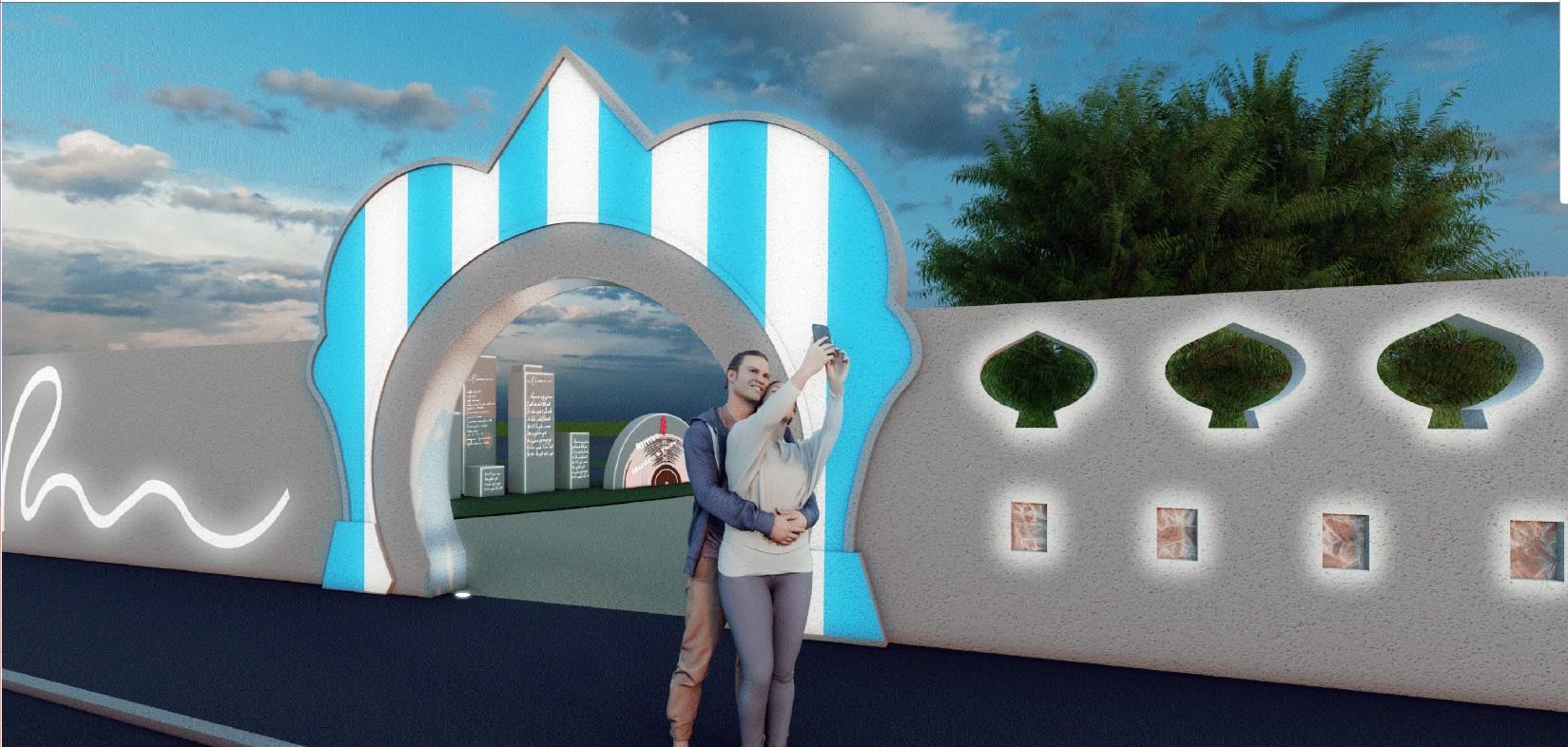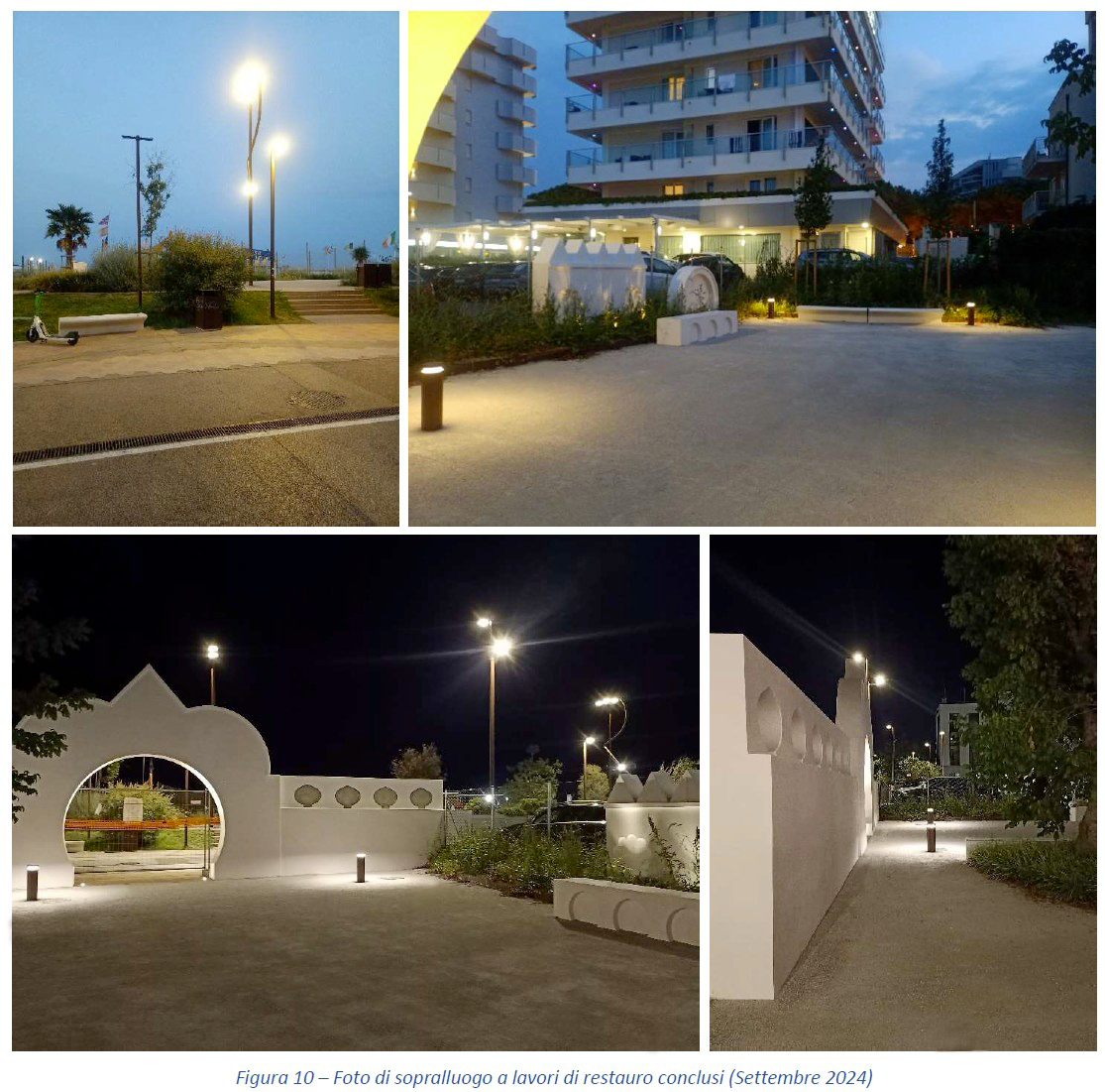 L'illuminazione si articolerà su due livelli: una proiezione fissa personalizzata sull'arco d'ingresso, visibile dal lungomare, e uno spettacolo video-dinamico all'interno dell'area giardino, che coinvolgerà anche i totem in cemento bianco già previsti nel progetto di riqualificazione. Le proiezioni saranno accompagnate da un sottofondo musicale sincronizzato, diffuso attraverso colonnine audio installate nel giardino interno.