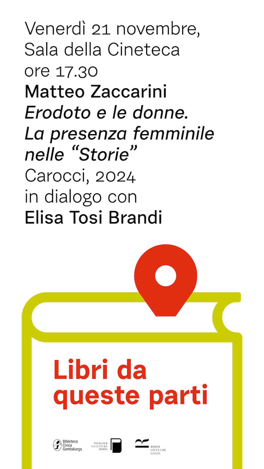 Nella settimana che anticipa la giornata mondiale per l’eliminazione della violenza sulle donne la rassegna “Libri da queste parti” dedica l’appuntamento di venerdì 21 novembre (Biblioteca Gambalunga, sala della Cineteca, ore 17.30) alla presentazione del libro di Matteo Zaccarini Erodoto e le donne. La presenza femminile nelle “Storie”. A dialogare con l’autore sarà la storica Elisa Tosi Brandi