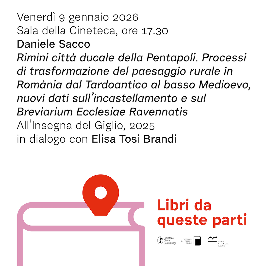 Protagonista dell’incontro sarà Daniele Sacco, che presenterà il volume: Rimini città ducale della Pentapoli. Processi di trasformazione del paesaggio rurale in Romània dal Tardoantico al Basso Medioevo, nuovi dati sull’incastellamento e sul “Breviarum Ecclesiae Ravennatis” (All’insegna del Giglio, 2025). L’autore, docente di archeologia cristiana, tardoantica e medievale presso l'Università degli studi Carlo Bo di Urbino dialogherà con la storica medievista Elisa Tosi Brandi, offrendo al pubblico uno sguardo inedito sulla Rimini prima dell’anno Mille, con riflessioni su come fosse organizzato il territorio, sulla nascita degli insediamenti e sul ruolo svolto dalle aree collinari e di pianura.