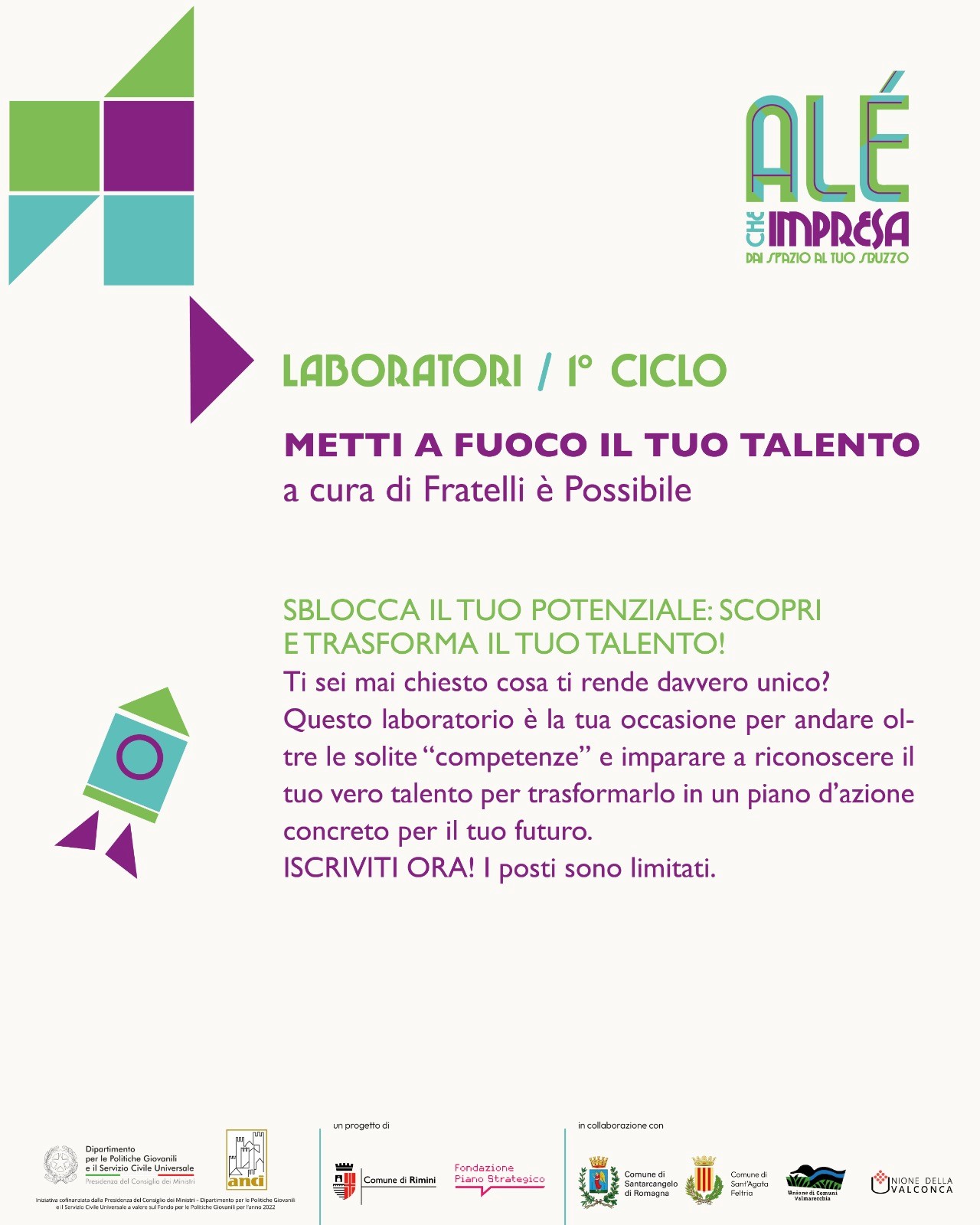 Scoprire il proprio talento, metterlo a fuoco e trasformarlo in energia per costruire il proprio futuro: con questi obiettivi prende il via “Metti a fuoco il tuo talento”, il primo ciclo di laboratori del progetto ALÉ che impresa! promosso dal Comune di Rimini, coordinato dalla Fondazione Piano Strategico e con la collaborazione con un partenariato territoriale che unisce Comuni e Unioni della Valmarecchia e della Valconca.