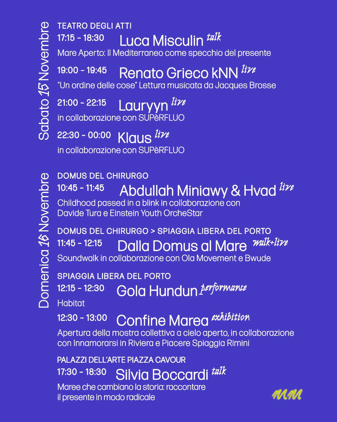 Due giorni – sabato 15 e domenica 16 novembre– in cui performance, concerti, incontri e riflessioni si intrecciano in un’esperienza diffusa tra il Teatro degli Atti, la Domus del Chirurgo, la spiaggia libera di Rimini e i Palazzi dell’Arte.