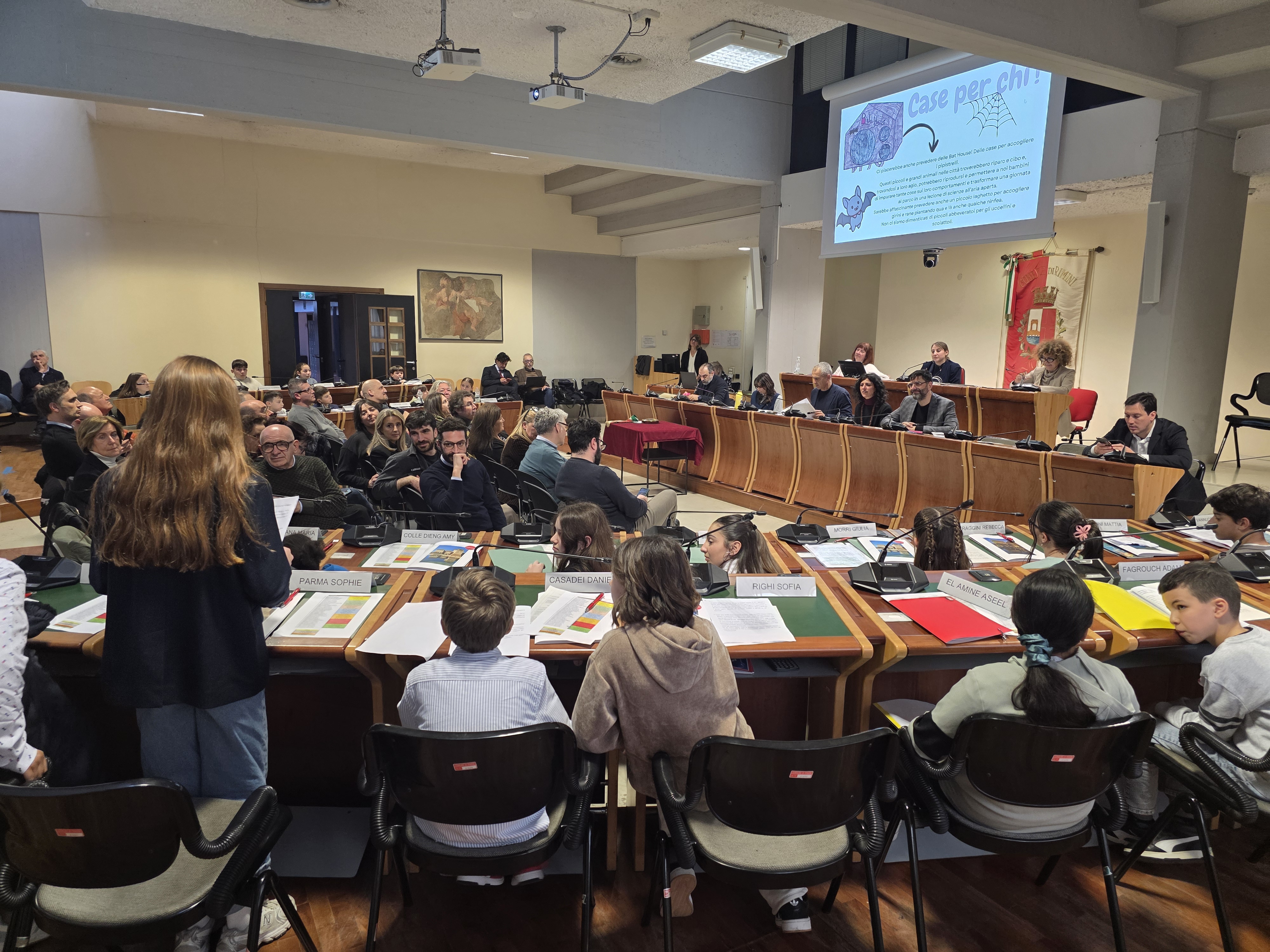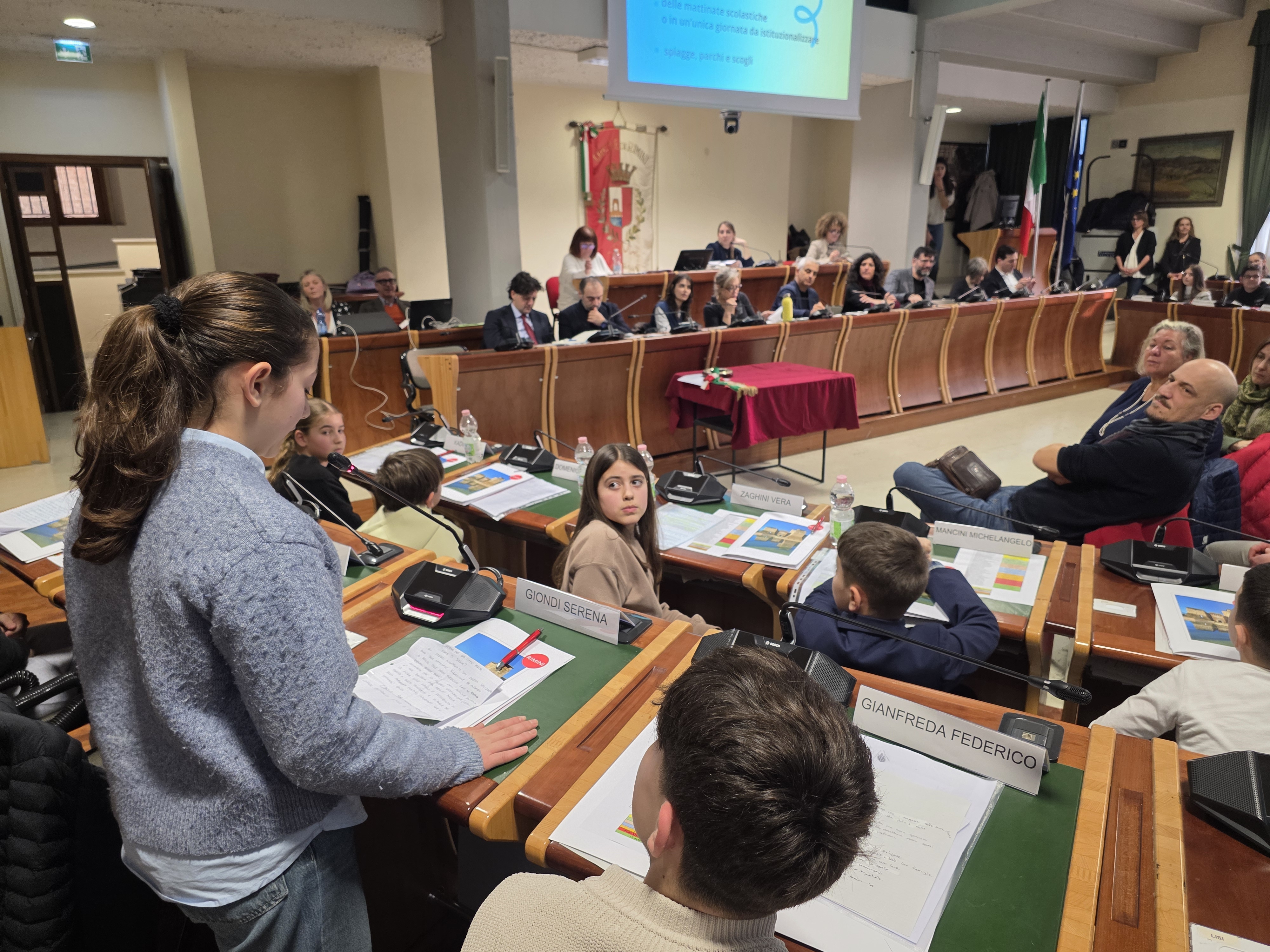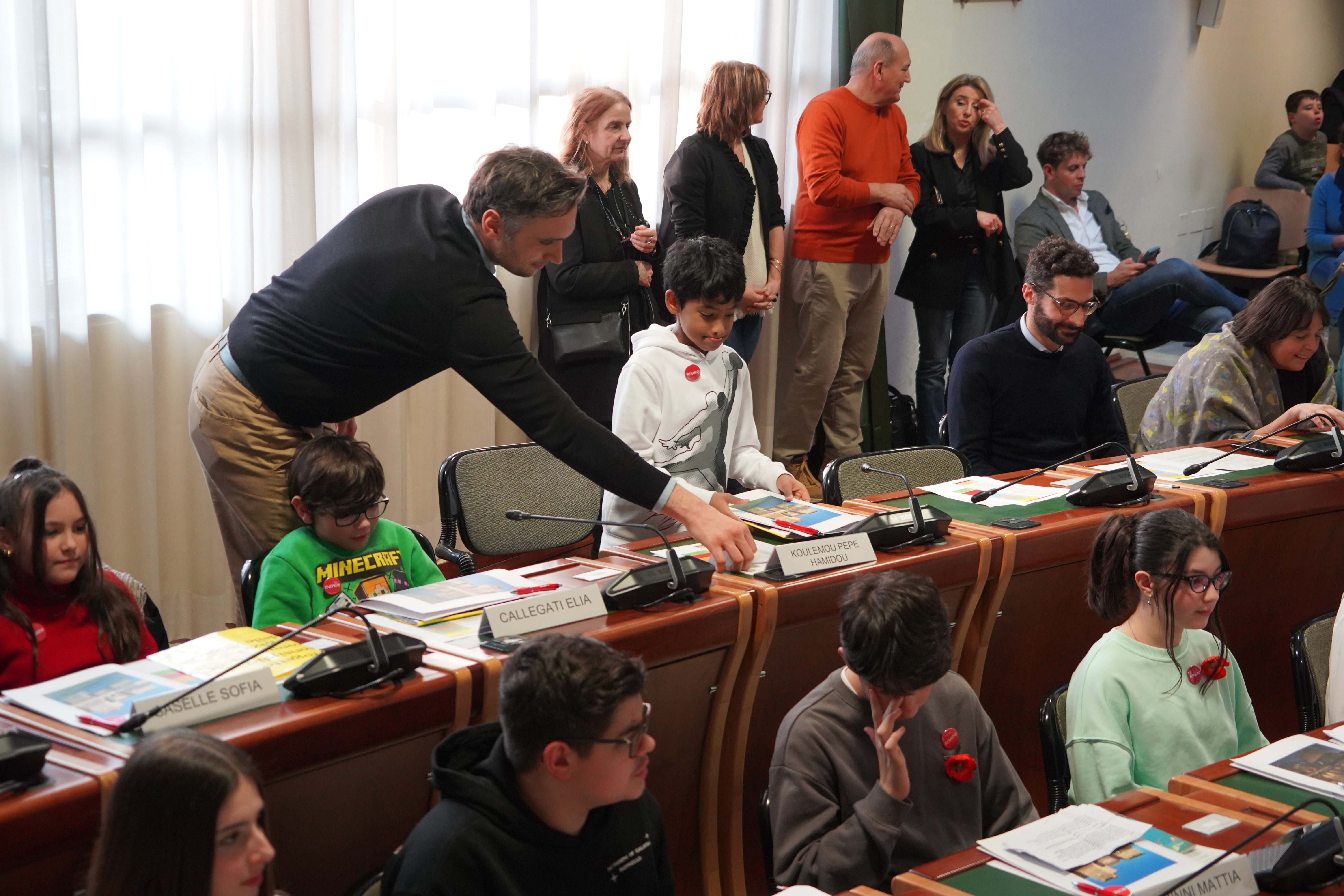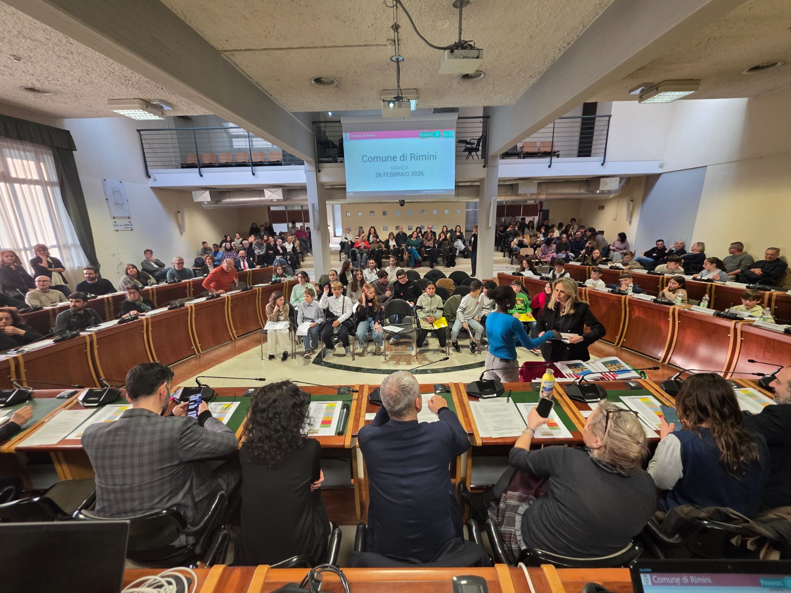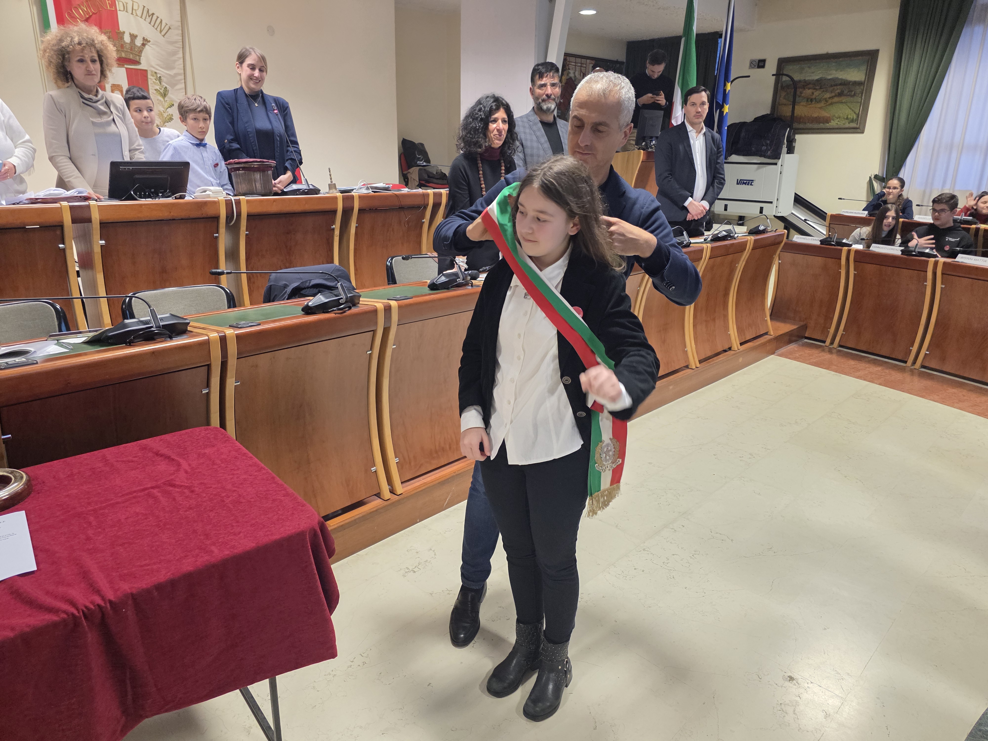 Alle ore 16:00, con la solennità che il luogo impone, la presidente del Consiglio comunale Giulia Corazzi e il sindaco Jamil Sadegholvaad hanno aperto la seduta con i consiglieri comunali in carica, seduti nei propri scranni come da consuetudine istituzionale. Poi, però, è accaduto qualcosa di insolito e simbolicamente potente: gli stessi consiglieri adulti si sono alzati dai propri banchi per lasciare il posto ai 32 giovani, che erano in attesa al centro della sala. Uno per uno, chiamati per nome dal Segretario Generale, i giovani consiglieri si sono avvicinati, hanno ricevuto dalle mani di un consigliere o di un assessore una cartellina istituzionale e si sono visti appuntare sul petto la spilletta con il logo del Comune di Rimini, prima di prendere posto al banco che da oggi li rappresenta.