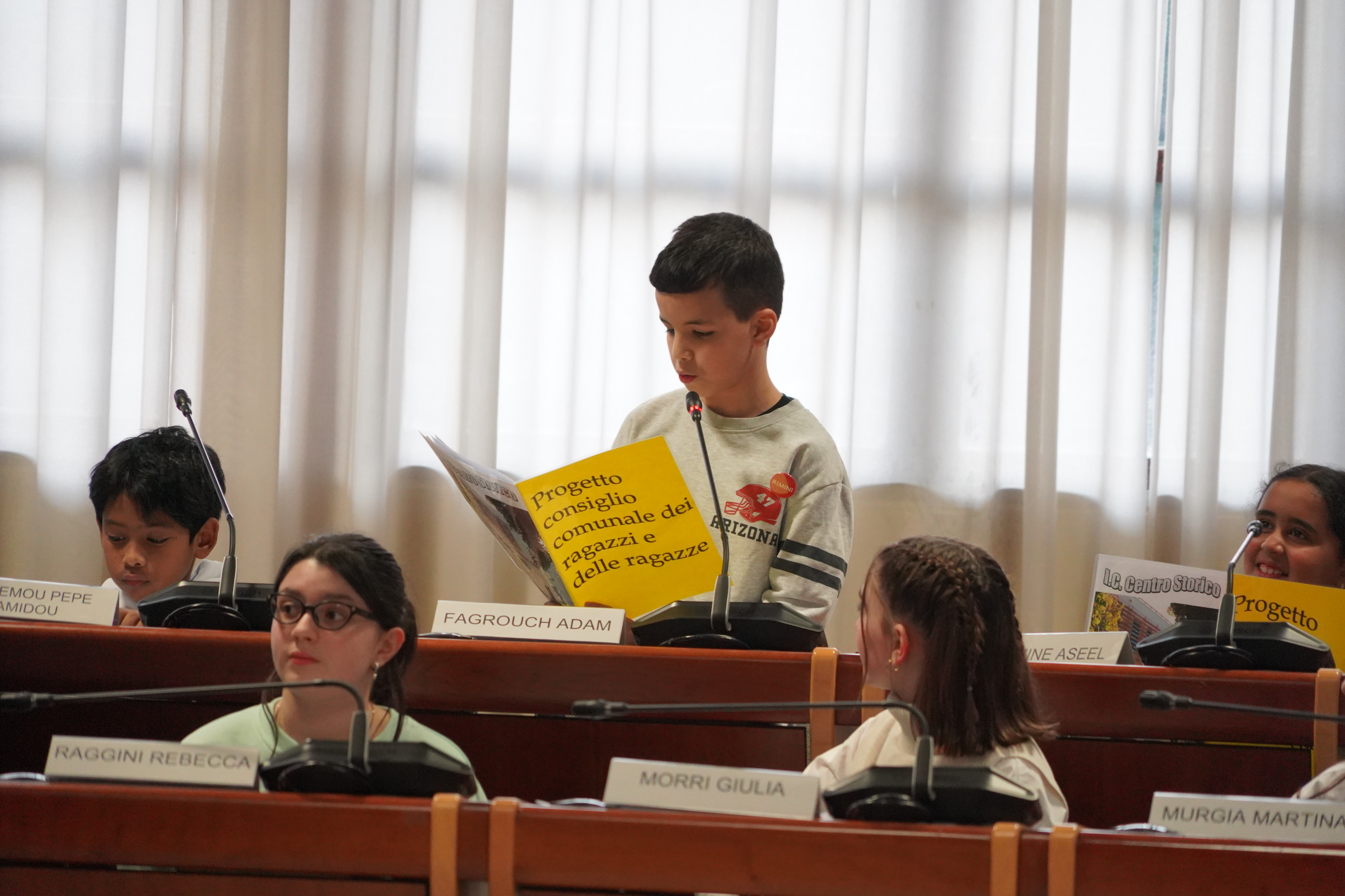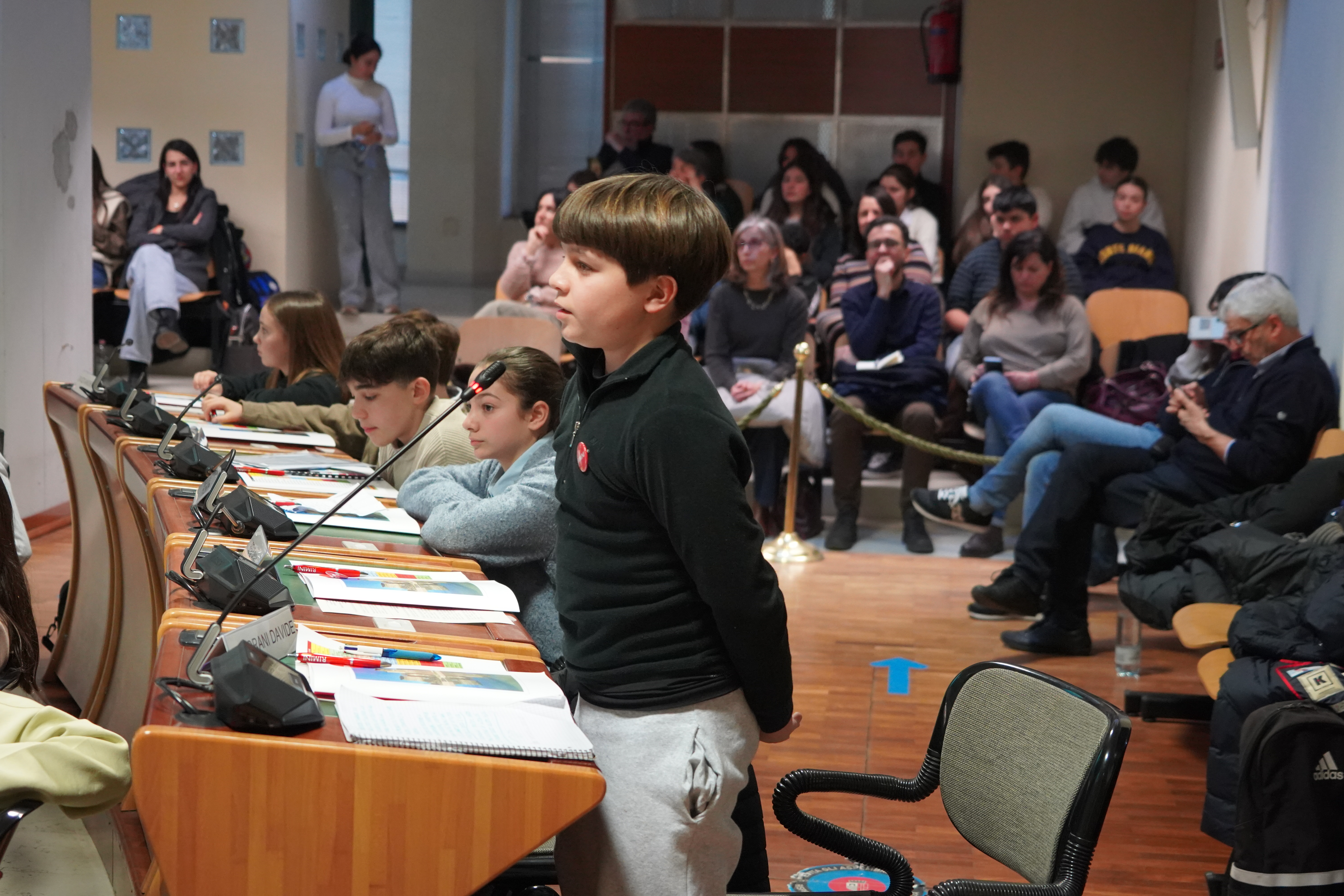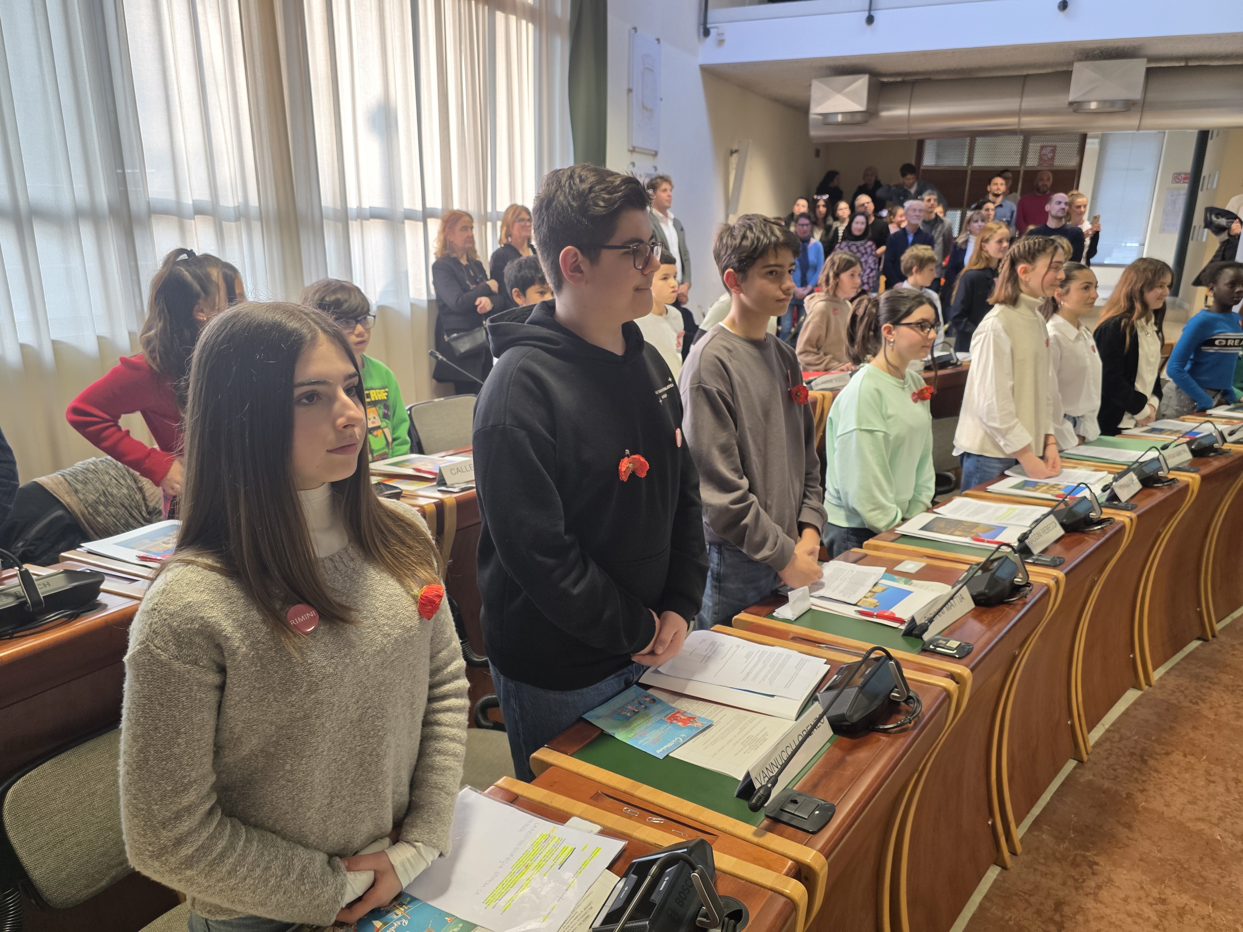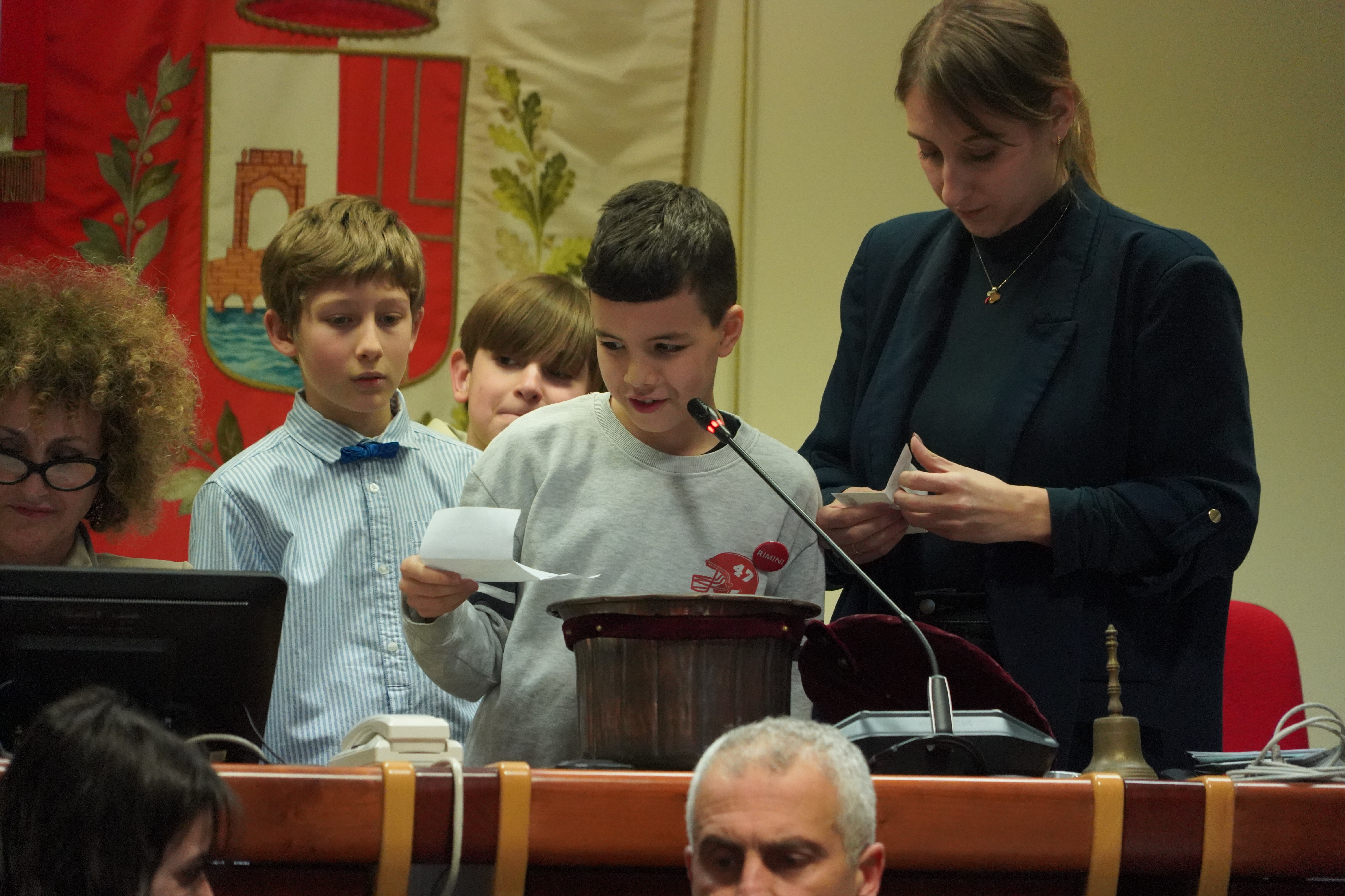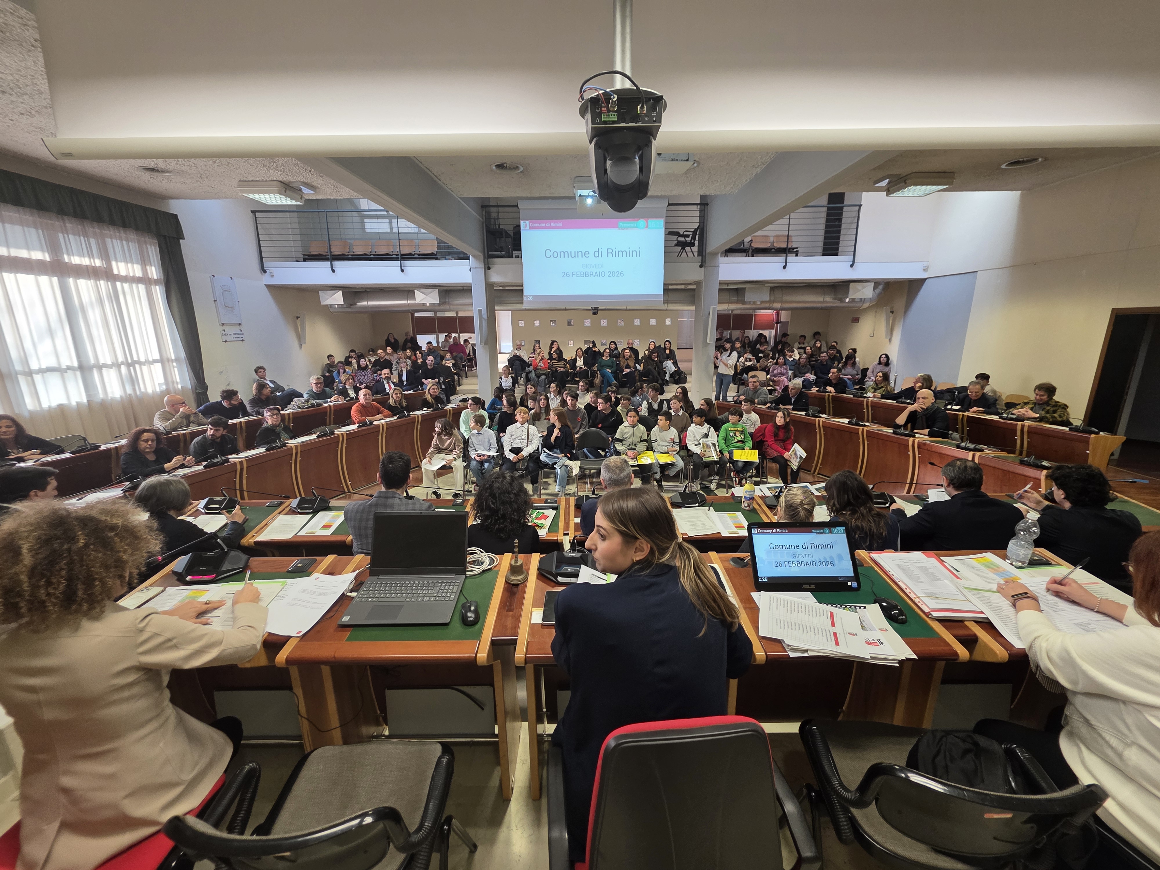 Alle ore 16:00, con la solennità che il luogo impone, la presidente del Consiglio comunale Giulia Corazzi e il sindaco Jamil Sadegholvaad hanno aperto la seduta con i consiglieri comunali in carica, seduti nei propri scranni come da consuetudine istituzionale. Poi, però, è accaduto qualcosa di insolito e simbolicamente potente: gli stessi consiglieri adulti si sono alzati dai propri banchi per lasciare il posto ai 32 giovani, che erano in attesa al centro della sala. Uno per uno, chiamati per nome dal Segretario Generale, i giovani consiglieri si sono avvicinati, hanno ricevuto dalle mani di un consigliere o di un assessore una cartellina istituzionale e si sono visti appuntare sul petto la spilletta con il logo del Comune di Rimini, prima di prendere posto al banco che da oggi li rappresenta.