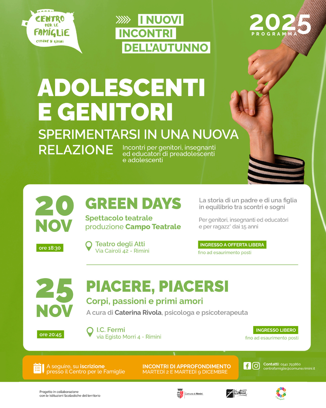 Riparte il percorso “Adolescenti e genitori: sperimentarsi in una nuova relazione”, rivolto a genitori, insegnanti ed educatori di ragazzi e ragazze nella fascia preadolescenza–adolescenza. Per inaugurare il percorso, mercoledì 20 novembre alle 18.30 al Teatro degli Atti si terrà lo spettacolo “Green Days”, rivolto ad adulti e a ragazze e ragazzi dai 15 anni. Un’apertura in forma teatrale, scelta proprio perché il teatro offre uno spazio “altro”: consente di toccare temi complessi passando dal corpo, dalle immagini e dall’emozione, rendendo così condivisibile e pensabile ciò che spesso è difficile nominare nel dialogo quotidiano. Nelle settimane a seguire, si terranno tre appuntamenti sul tema affettività e sessualità condotti da professioniste, psicologhe e psicoterapeute per entrare nel vivo delle domande emerse (per info: Centro per le famiglie Comune di Rimini Tel 0541/793860 e-mail: centrofamiglie@comune.rimini.it)