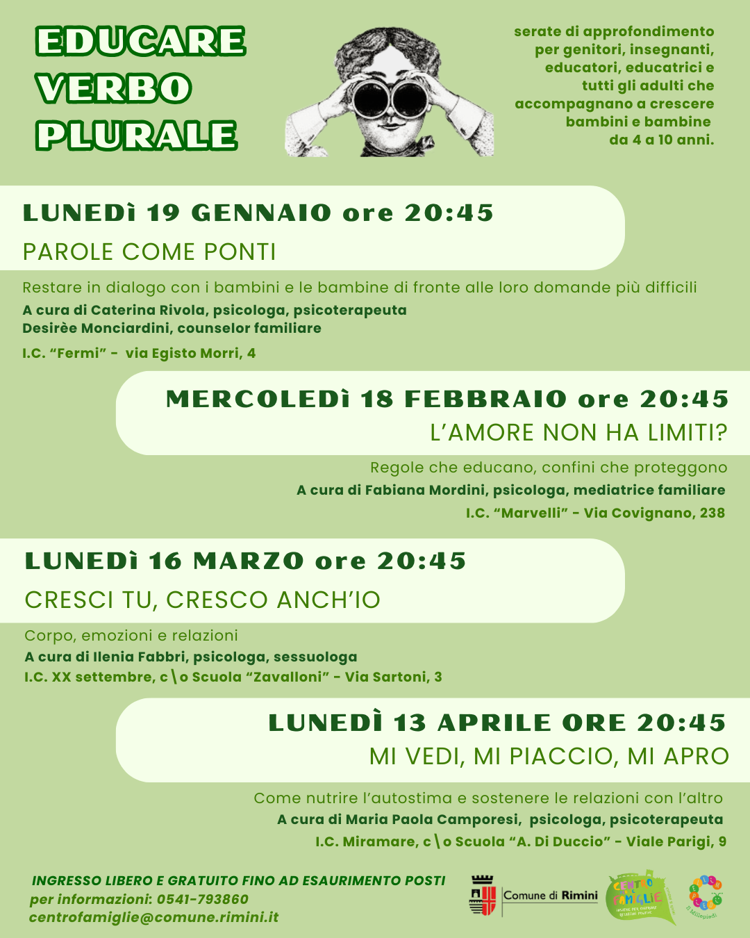 Continua anche nell’anno nuovo il percorso Educare Verbo Plurale, ciclo di incontri a cadenza mensile, dedicati a genitori, educatori e a tutte le persone che accompagnano nella crescita bambini e bambine da 4 a 10 anni.