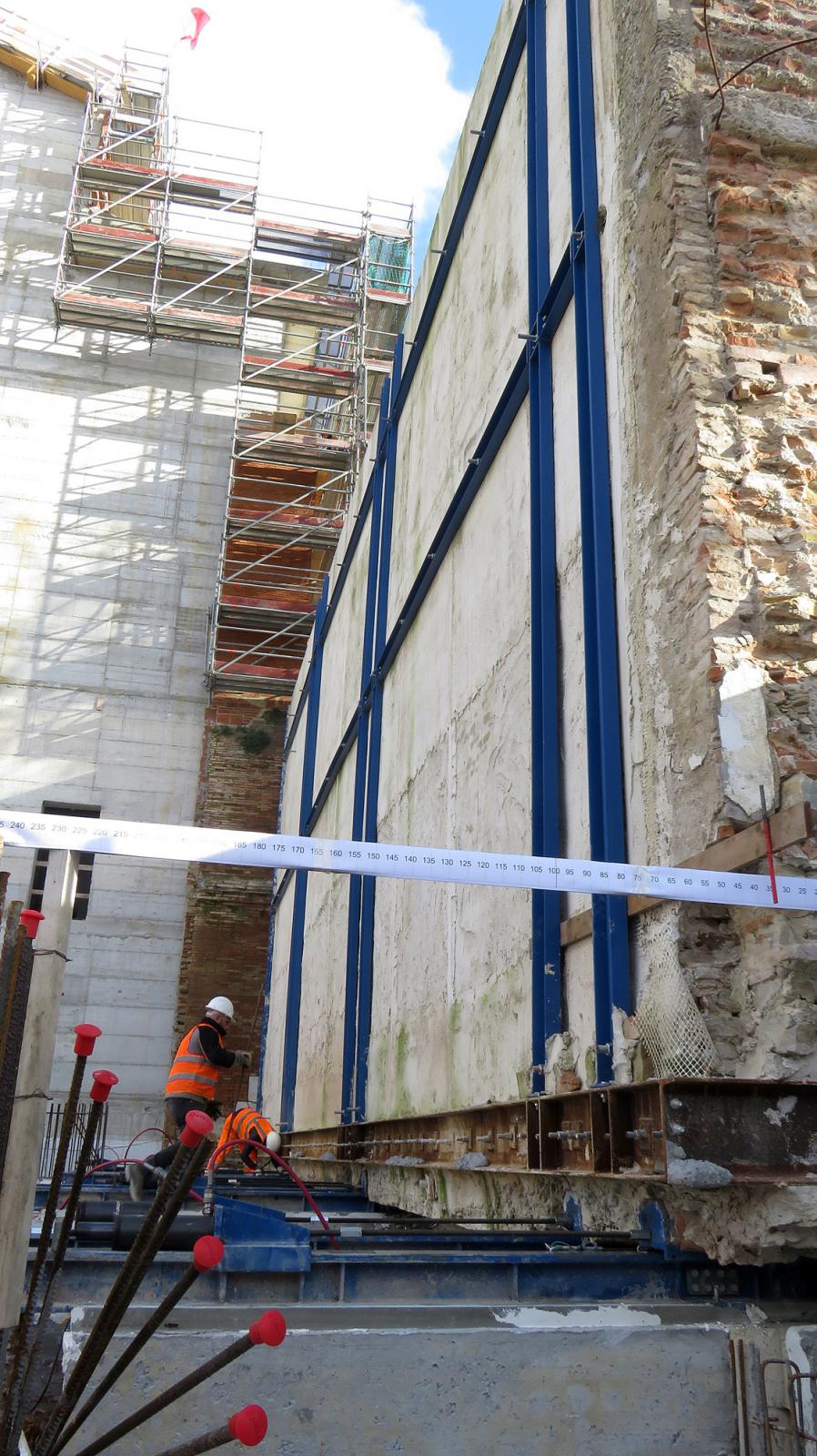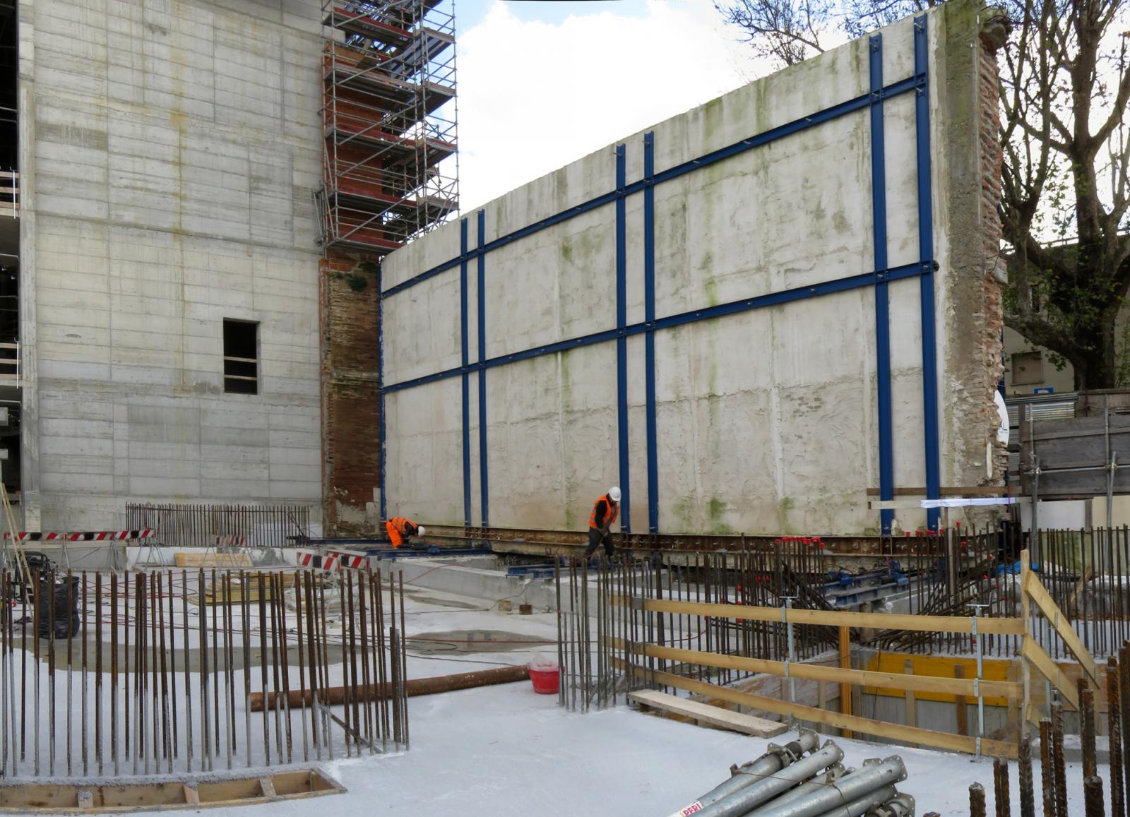 Allora le murature, dopo essere state “cinturate” con il montaggio della carpenteria, furono tagliate e trasferite su un sistema slitta binario per poi essere traslate attraverso un sistema idraulico di spinta sincronizzato costituito da 4 vie idrauliche indipendenti coordinate da un PC, in modo da preservarne l'integrità.