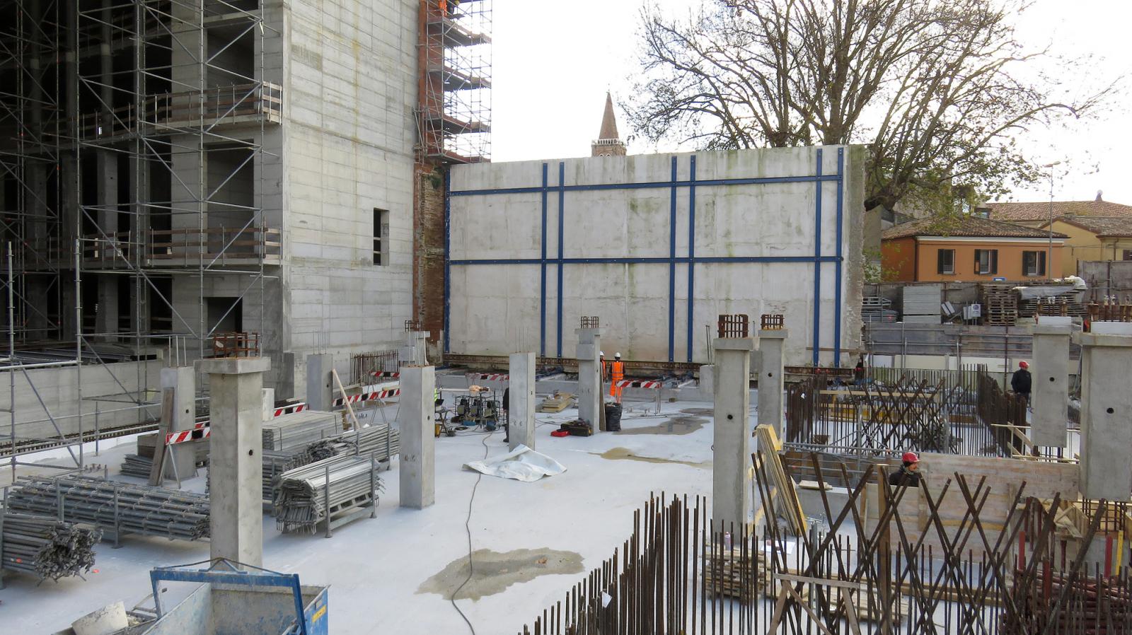 Mentre sta proseguendo il completamento del rivestimento esterno con i mattoni “faccia a vista” nel Corpo A destinato alla Sala del teatro, con la traslazione delle pareti storiche per ricreare il perimetro originario del Poletti, ha preso avvio  la realizzazione dell’ultima parte mancante del Corpo B destinato alla Torre scenica dove collocare tutta la meccanica di scena, proseguendo i lavori dopo aver già realizzati i due piani interrati ed i pilastri di sostegno della struttura del Palcoscenico che si trova ad quota più alta del livello di piazza Malatesta.
