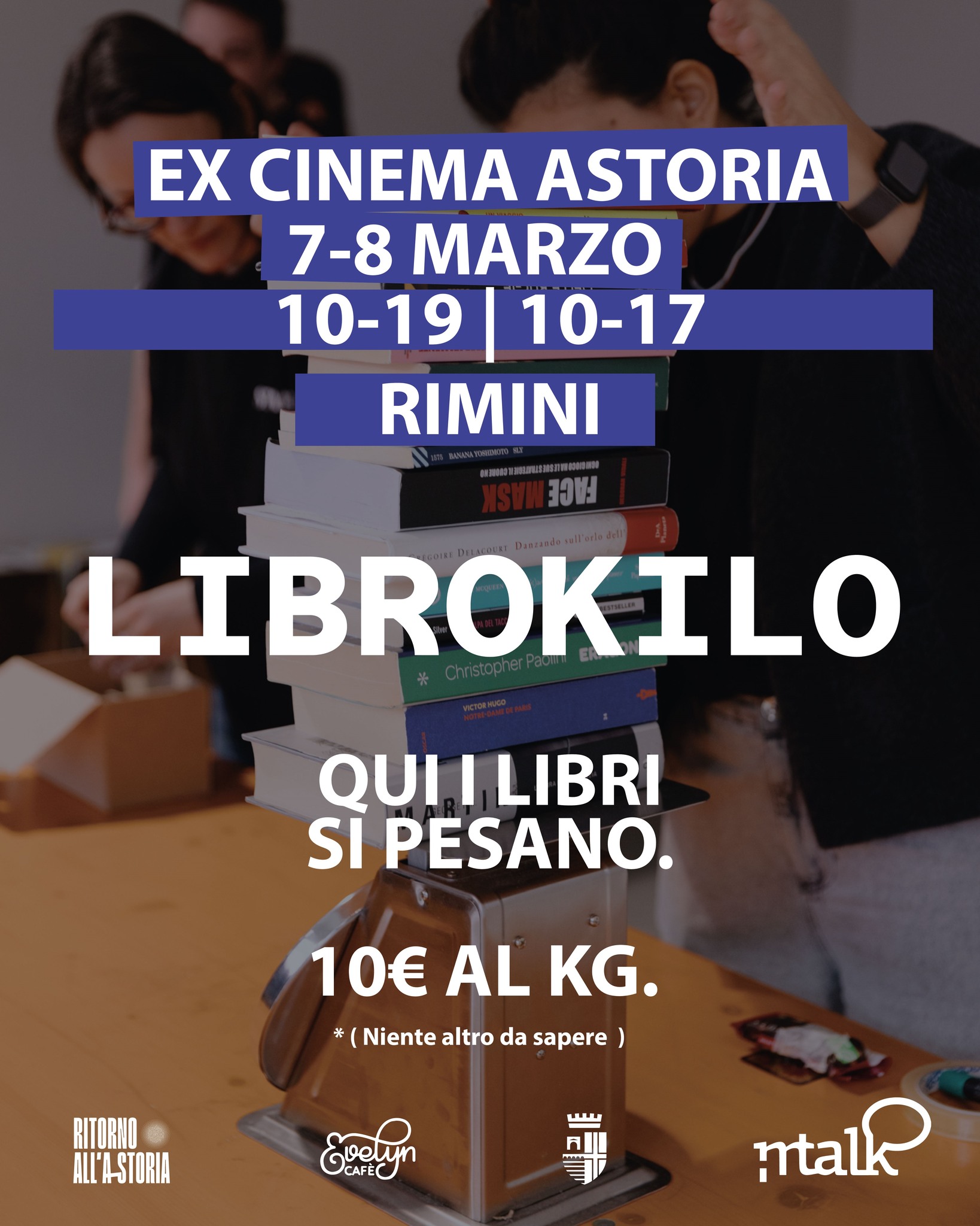 Le iniziative continuano con un appuntamento speciale all’Ex Cinema Astoria nel weekend del 7-8 marzo: per la prima volta arriva a Rimini Librokilo, un’iniziativa di scambio e vendita di libri a peso, che promuove la cultura sostenibile e il riuso dei volumi con una vasta selezione di libri salvati dal macero.