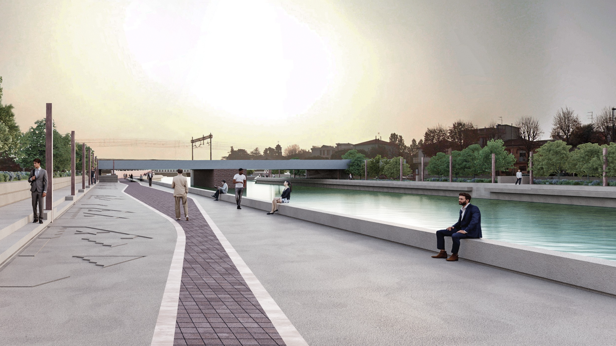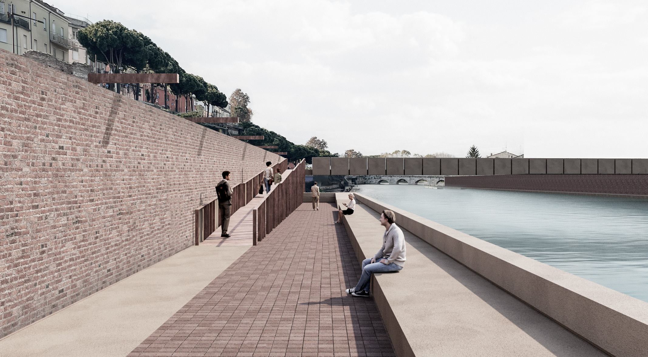 Il cuore dell'intervento è rappresentato dal sistema a gradoni denominato "orlo minerale": un elemento architettonico continuo che rimodella le banchine — senza alterare l'alveo storico del fiume — innalzando la quota di calpestio e restituendo spazi più ampi e fruibili. Una soluzione a tre strati che dialoga visivamente con le mura antiche, conferendo al lungofiume un segno omogeneo e contemporaneo. Attorno a questa struttura si articoleranno percorsi pedonali, elementi a seduta, gradonate, aree verdi e giochi d'acqua, percorribili anche da mezzi di servizio e manutenzione.