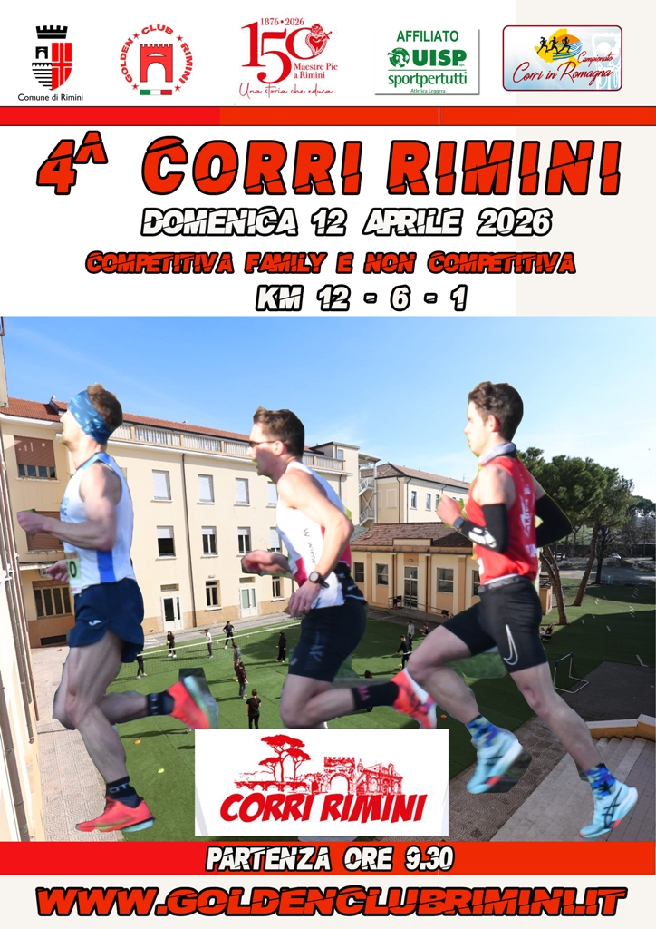La manifestazione, aperta ad atleti di tutte le età, abilità o disabilità, propone Corri Rimini Competitiva e non competitiva Km 12,5 - 6,5 - 1 con ritrovo presso le Maestre Pie (Via Bastioni Meridionali 25). Questa festa del movimento quest'anno si celebra, infatti, in occasione dell’importante traguardo dei 150 anni dalla Fondazione delle Maestre Pie, un luogo simbolo che festeggia un secolo e mezzo di impegno educativo sul territorio.