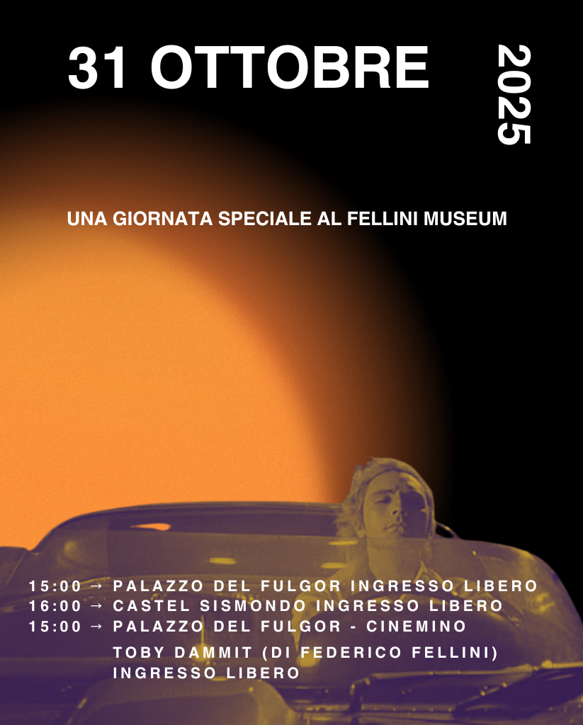Il Fellini Museum è visitabile gratuitamente: dalle ore 16 la sede di Castel Sismondo; dalle ore 15 la sede di Palazzo del Fulgor. Alle ore 15 a Palazzo del Fulgor una proiezione speciale a ingresso libero: TOBY DAMMIT, di Federico Fellini (Italia 1968, 43′)
