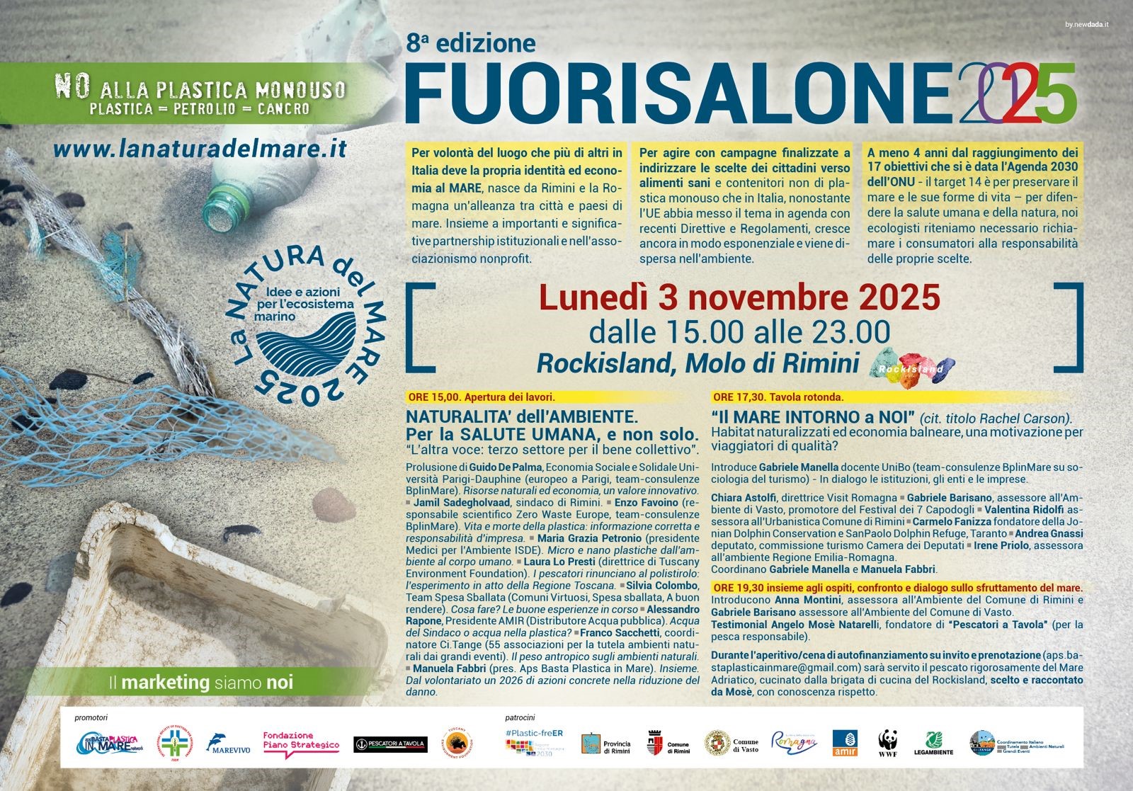 FUORISALONE 2025 è promosso da APS Basta Plastica in Mare Network, in collaborazione con ISDE (medici per l’Ambiente), MAREVIVO, Fondazione Piano Strategico, Comuni Virtuosi, A Buon Rendere, Spesa Sballata. Con il patrocinio di Regione Emilia-Romagna, Provincia di Rimini, Comune di Rimini e Comune di Vasto.