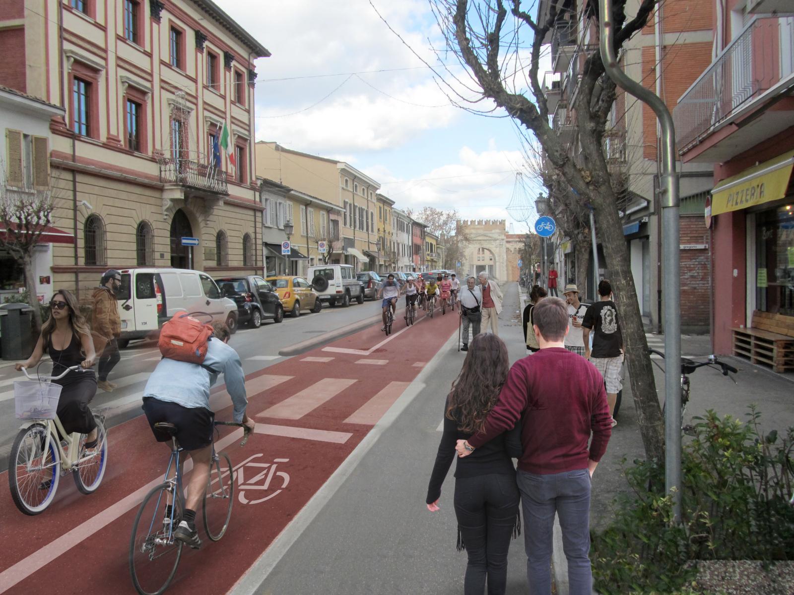 Lungo via XX Settembre si prevede (costo previsto 400.000 euro) la rifunzionalizzazione dell’asse ciclabile Arco d'Augusto - via Tripoli e la sostituzione delle due attuali corsie carrabili con un’unica corsia a senso unico per i mezzi carrabili e una corsia con pista ciclabile bidirezionale in sede propria. Il marciapiede lato mare sarà allargato aumentando la fruibilità pedonale e accrescendo la valenza del Borgo San Giovanni come naturale estensione del centro storico. Sul tratto di Via Flaminia da via Tripoli all'ospedale verrà ridotta l'ampia sede stradale, senza penalizzare flussi e sensi di marcia esistenti, e realizzata una pista ciclabile bidirezionale in sede propria. Verrà inoltre migliorato l’attraversamento trasversale della via Flaminia, potenziando e mettendo in sicurezza gli attraversamenti pedonali e ciclopedonali e ripensando le fermate del TPL.