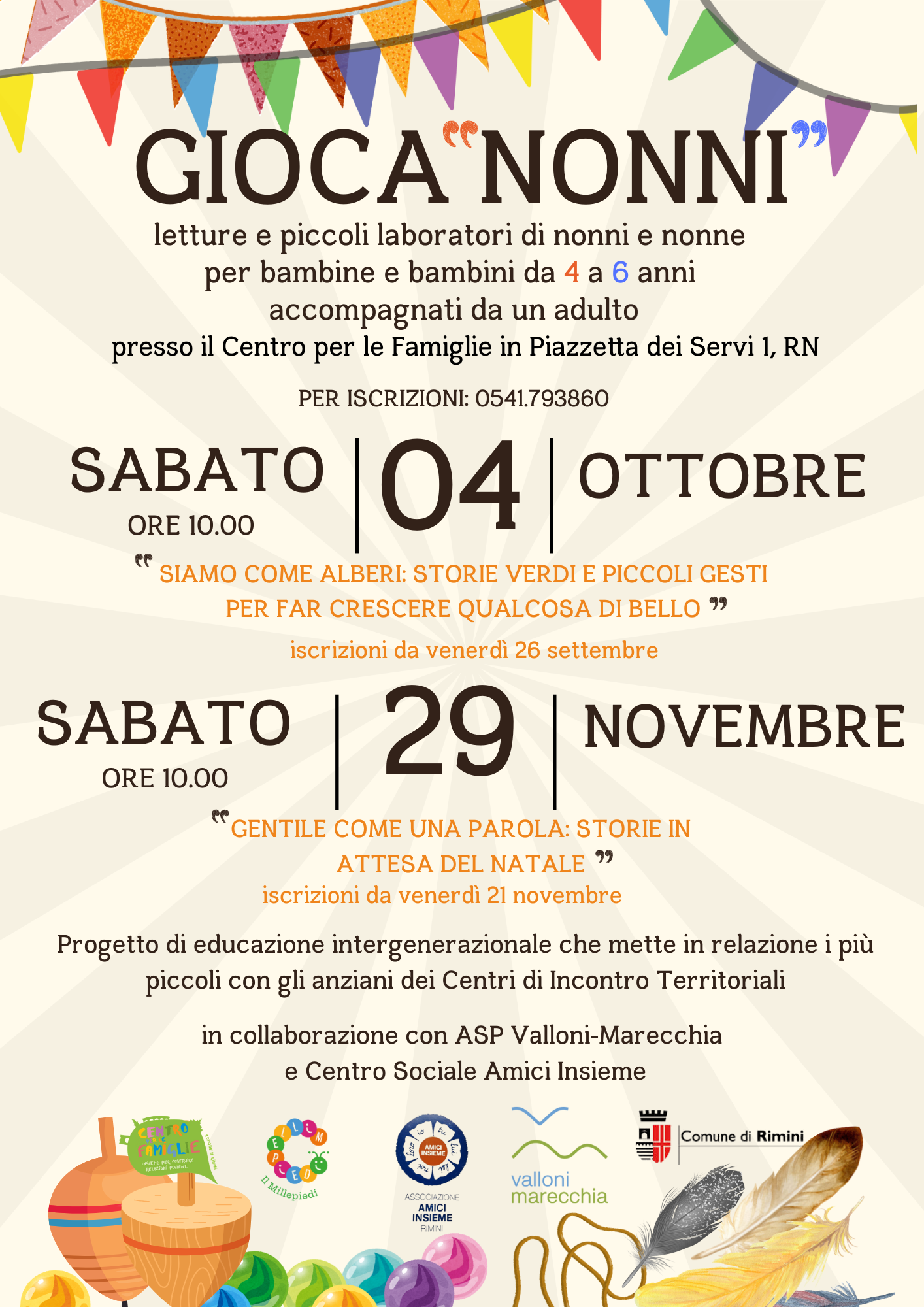 Anche in questa programmazione il Centro per le Famiglie del Comune di Rimini,  insieme ad ASP Valloni Marecchia e al Centro Sociale Amici Insieme, prosegue con Gioca "Nonni", il progetto di educazione intergenerazionale che riconosce il ruolo della terza età nel processo di crescita dei più piccoli.