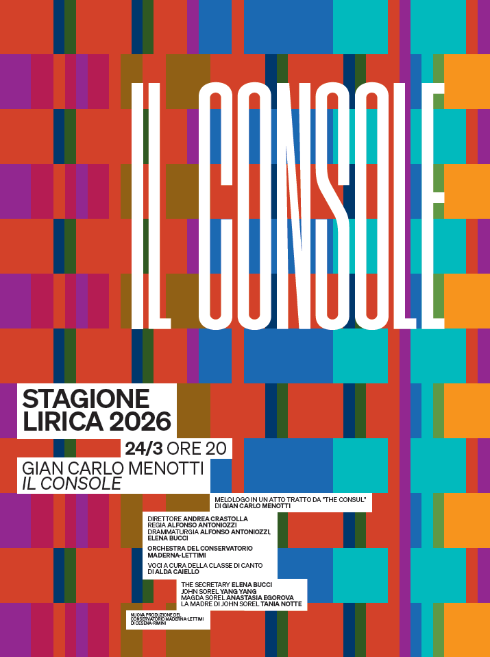 La Stagione lirica 2026 del Teatro Galli prosegue martedì 24 marzo (ore 20) con la nuova produzione del Conservatorio Maderna-Lettimi di Cesena- Rimini Il console di Gian Carlo Menotti, capolavoro del teatro musicale del Novecento nella nuova produzione del Conservatorio Maderna-Lettimi di Cesena-Rimini.