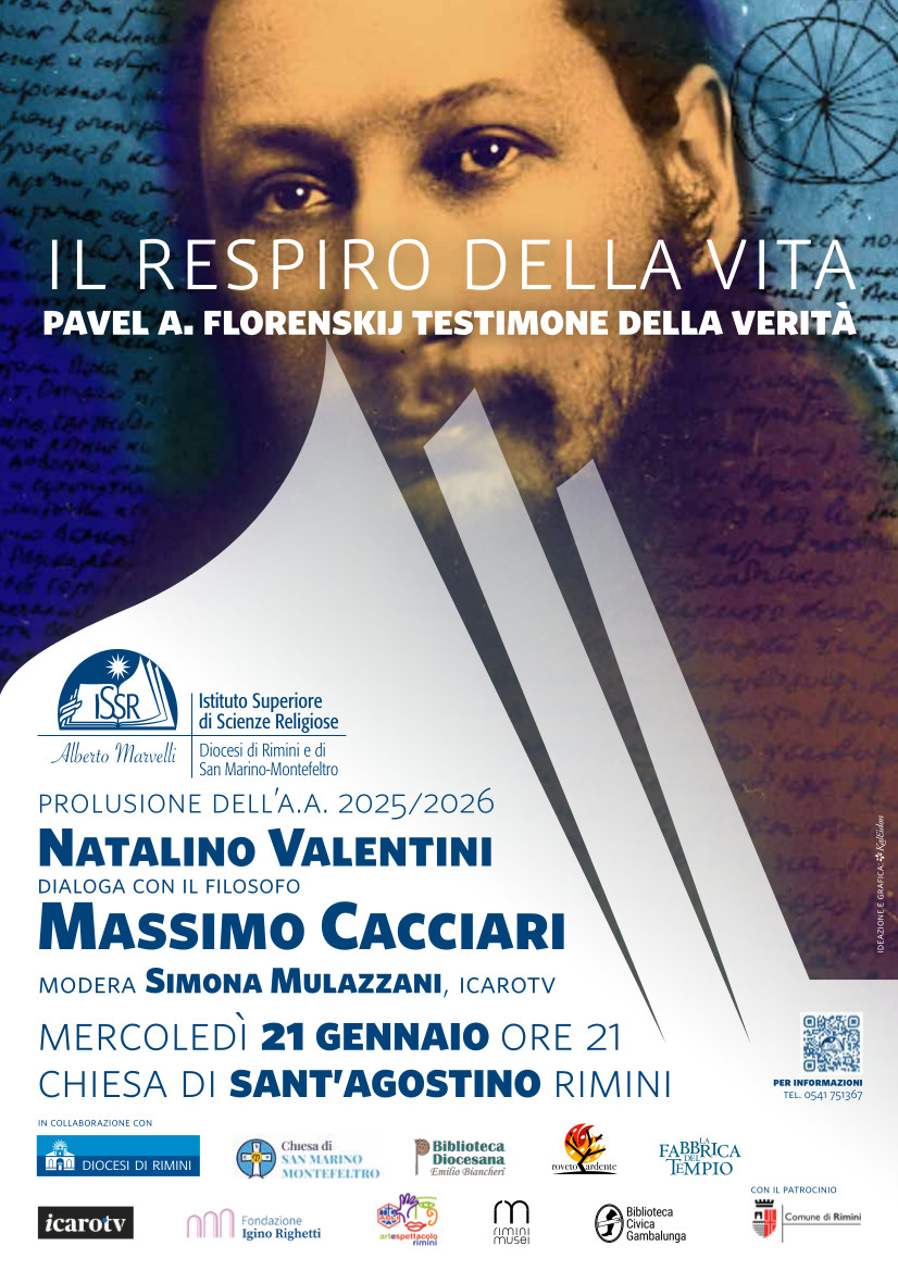 Mercoledì 21 gennaio alla Chiesa di Sant’Agostino, il prof. Massimo Cacciari dialoga con il prof. Natalino Valentini, direttore dell’ISSR “A. Marvelli”, sul tema: Il respiro della vita. P. A. Florenskij testimone della verità. A moderare la serata è Simona Mulazzani, direttrice di Icaro TV.