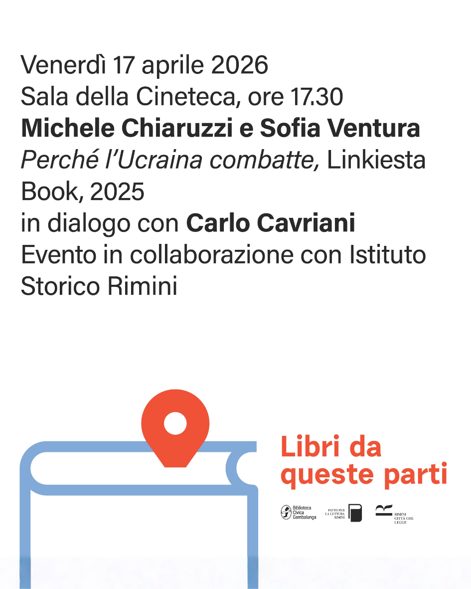 Venerdì 17 aprile, nella Sala della Cineteca (ore 17.30), i politologi Michele Chiaruzzi e Sofia Ventura presentano Perché l’Ucraina combatte (Linkiesta Book, 2025). L’appuntamento di approfondimento storico e politico, organizzato in collaborazione con l’Istituto per la storia della Resistenza e dell’età contemporanea della provincia di Rimini, nell’ambito della rassegna Libri da queste parti, si interroga sulla natura della resistenza ucraina, espressa anche sul terreno della cultura e della comunicazione. A dialogare con gli autori sarà il capocronista del Resto del Carlino Rimini, Carlo Cavriani.
