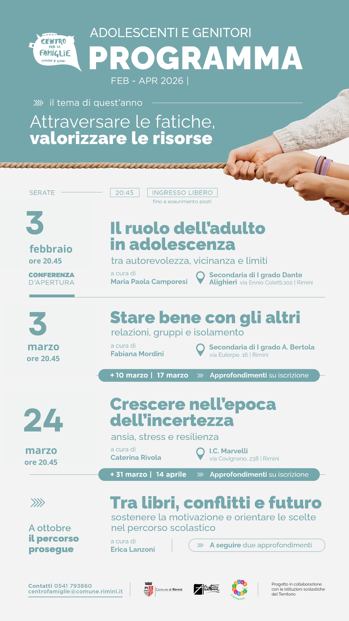 Al via una nuova edizione del percorso “Adolescenti e genitori: attraversare le fatiche, valorizzare le risorse”, promosso dall’Assessorato alla Scuola e alle Politiche Educative e organizzato dal Centro per le Famiglie del Comune di Rimini, in collaborazione con gli Istituti Comprensivi del territorio e l’Associazione Teatrale Alcantara.
